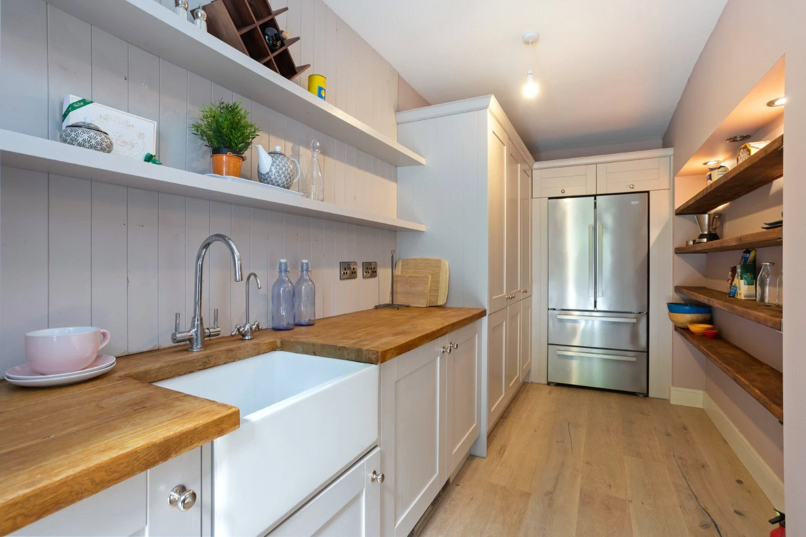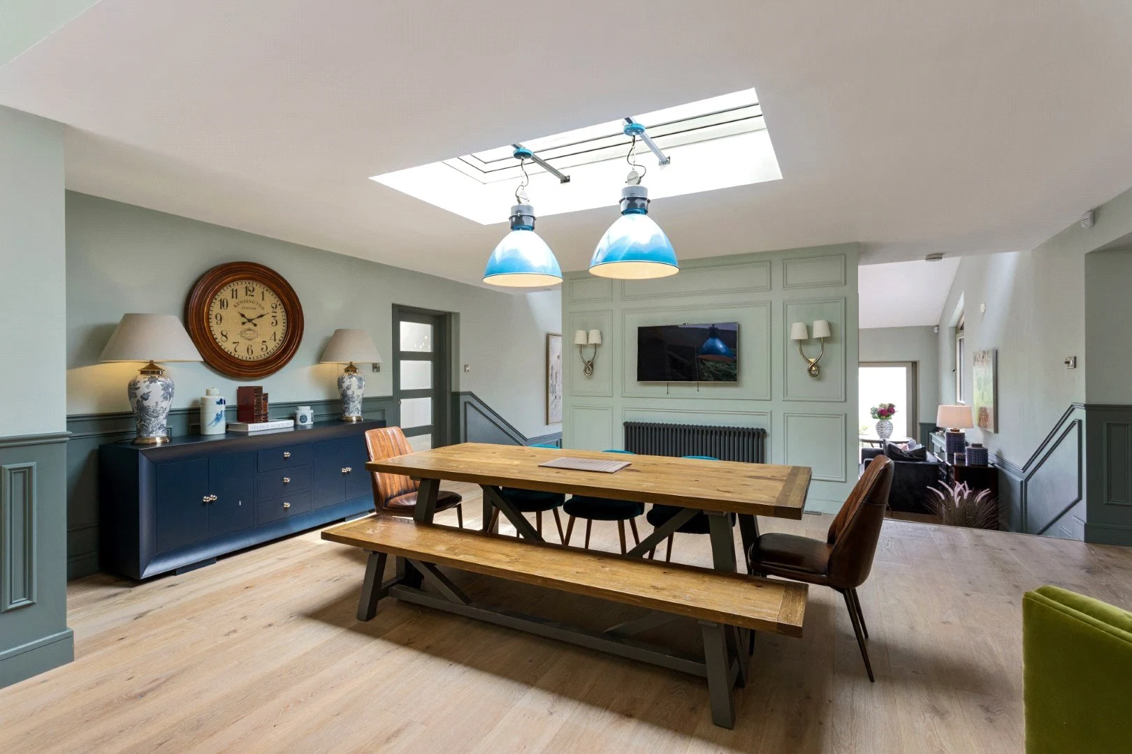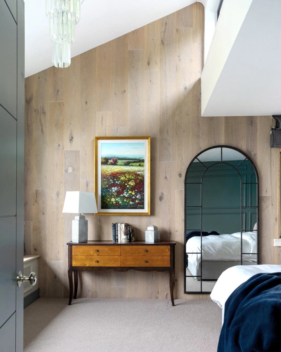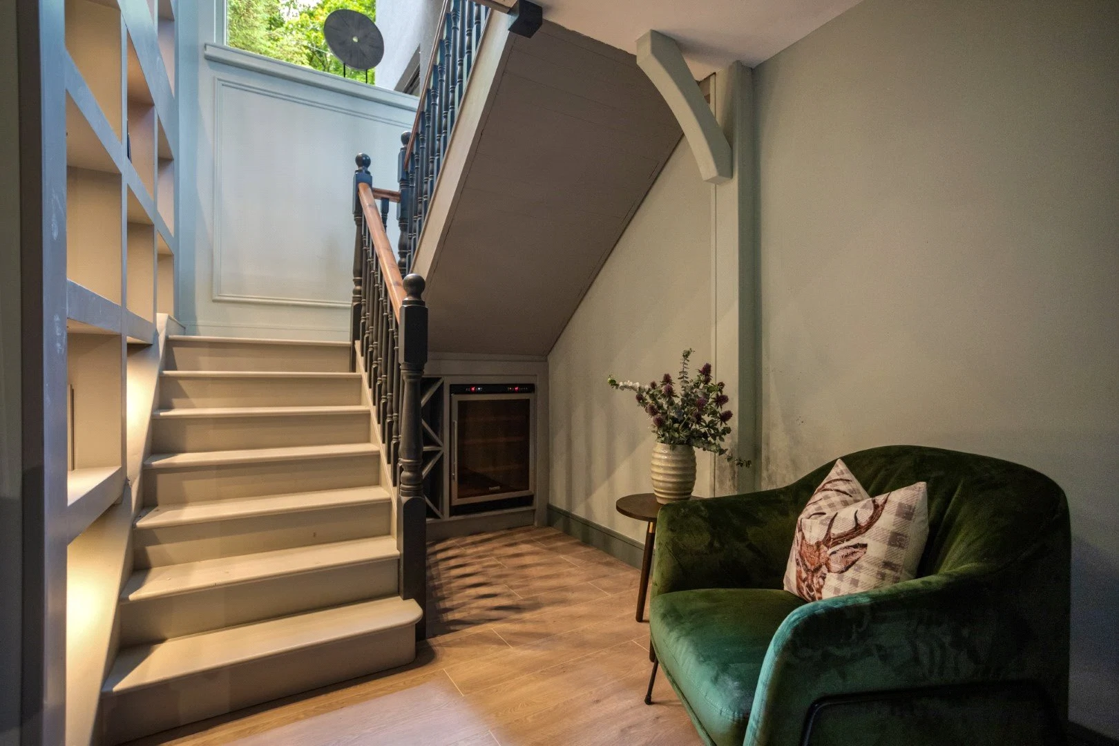 Down a small flight of steps is the living space, a show stopping double-height space with views over the Lough. Panelling that runs from the kitchen through to this room helps the large space feel cohesive, while also adding character. The living room also leads out to an outdoor terrace, perfect for enjoying the views in good weather.
