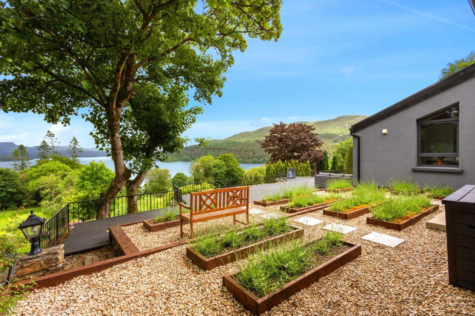 Outside, the garden has been landscaped to include mature trees, a lavender garden and lawn areas, while there is a jetty that provides access to the water, perfect for fishing, swimming and various water activities.