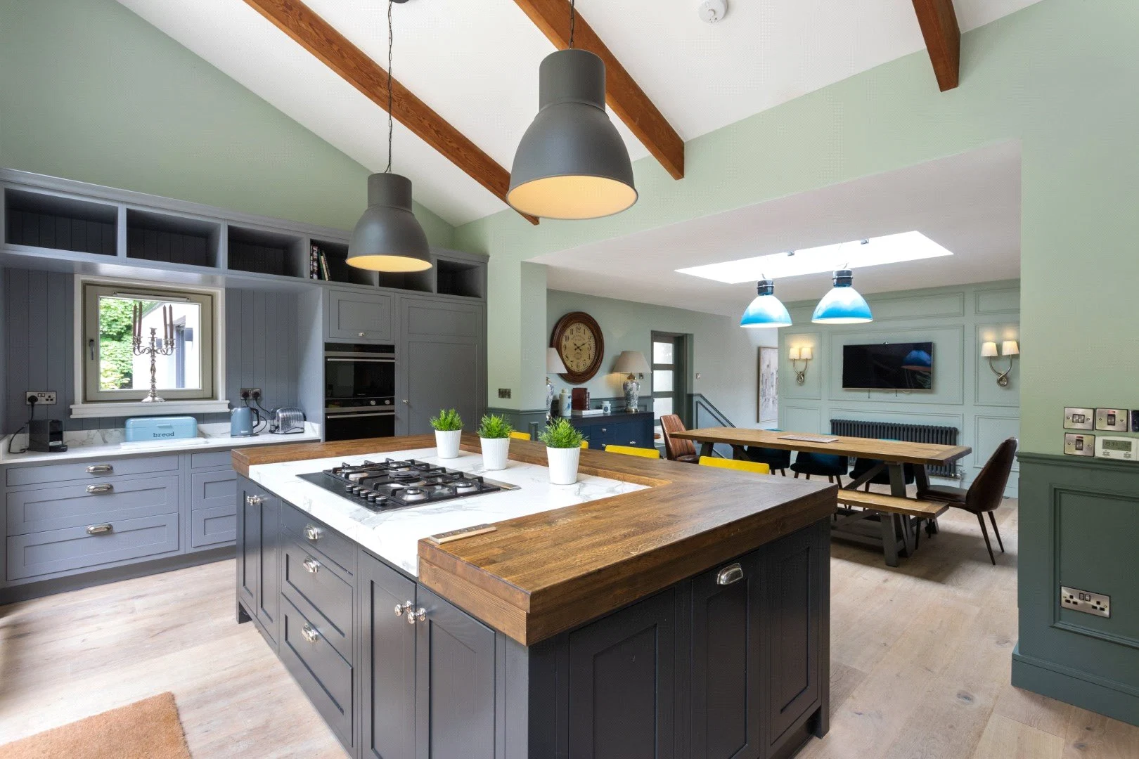 One of the main spaces in the home is a large open-plan kitchen living and dining area on a split level. The kitchen has a vaulted ceiling with floor to ceiling windows, making it bright, which is added to by the skylight over the dining area. A pantry off the kitchen gives plenty of storage space, and the kitchen island provides an additional seating area.