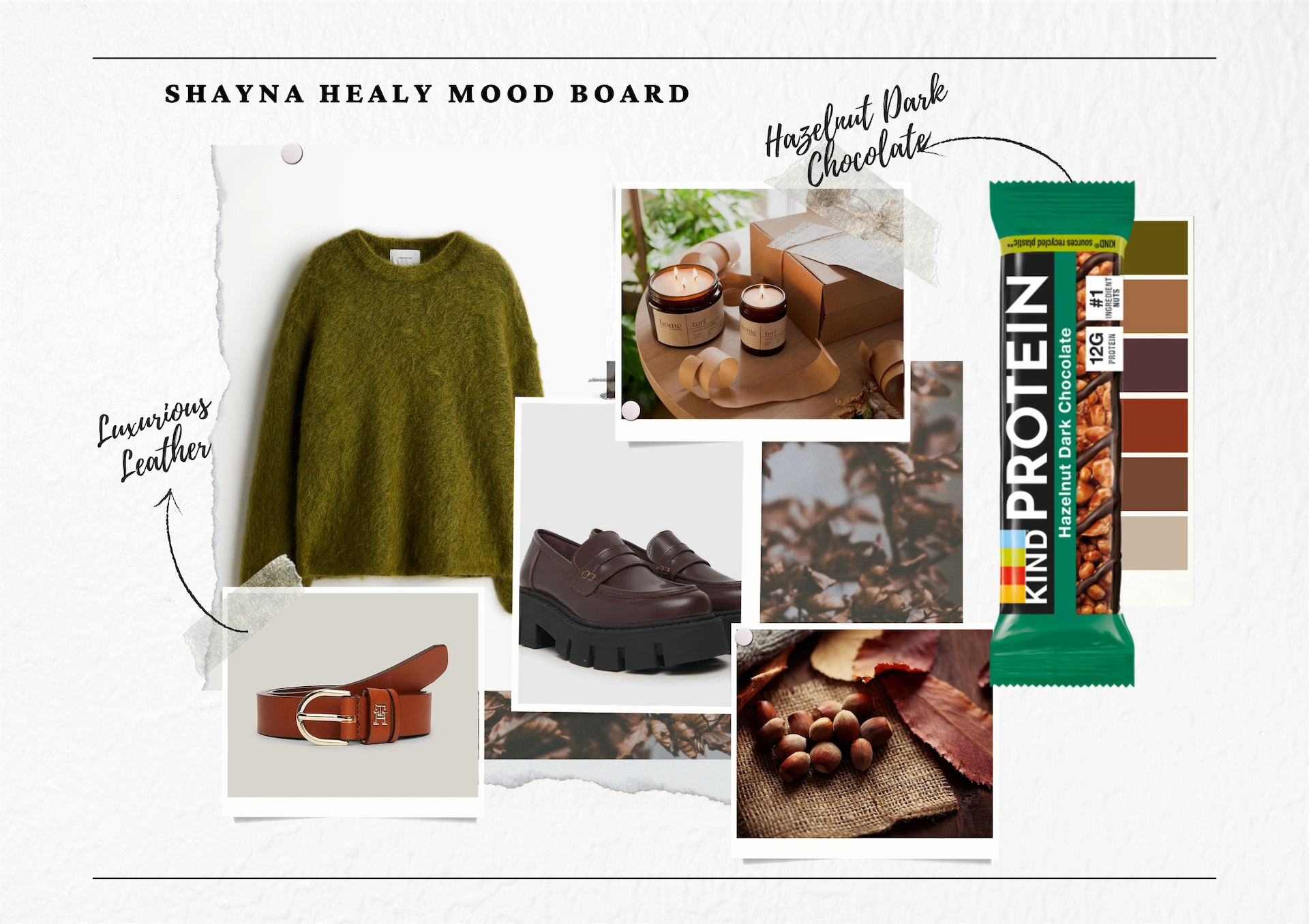 I’ve also had my eye on chocolatey browns and rich tans to warm up my style for the cosy season – like these burgundy chunky loafers from Schuh and cognac leather belt with gold detailing from Tommy Hilfiger. As far as setting the right ambiance, my favourite candle at the moment is Turf by The Home Moment and my go-to sweet treat is the KIND Hazelnut Dark Chocolate bar, both of which are perfectly paired with a night on the sofa watching a spooky film, a brew of hot cocoa in hand.