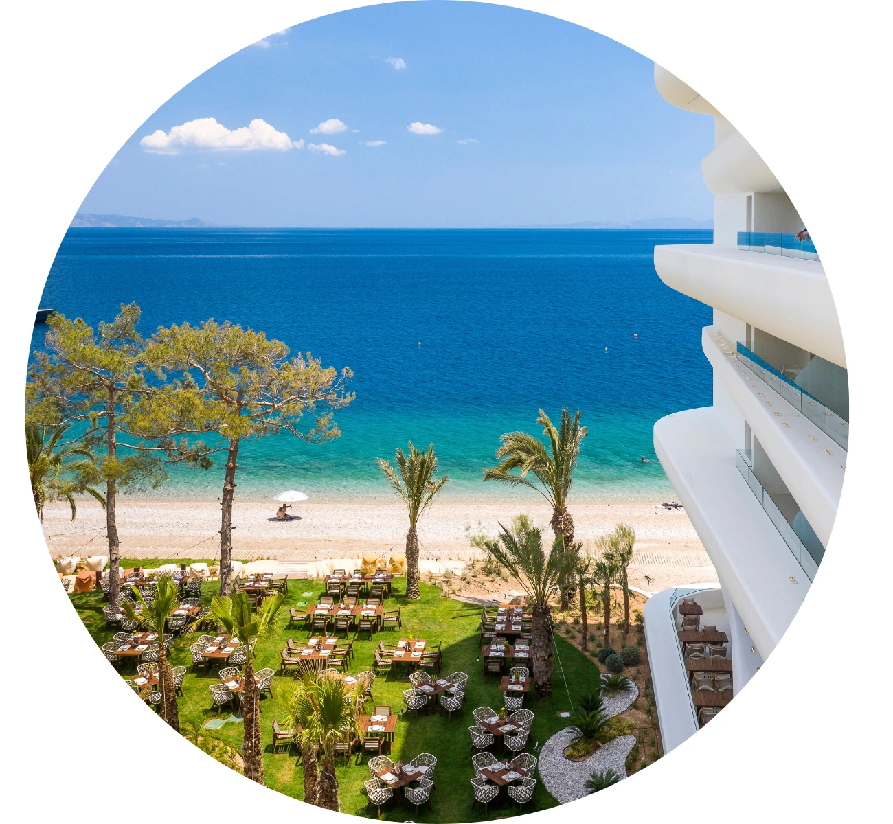 A paradise of bliss, elegance and tranquillity presents itself at the luxurious five-star Isla Brown Corinthia hotel on the Saronic Gulf, just 50 minutes from Athens. On arrival, I was blown away by the hotel’s exterior; it was breathtakingly beautiful with its towering palm trees, immaculate outdoor seating areas and some very slick-looking infinity swimming pools in the distance – not to mention a private beach just metres away. Before even setting foot in the hotel, I thought, “Was I just in Athens less than an hour ago?!”