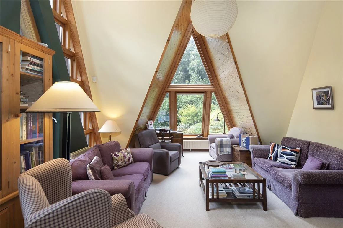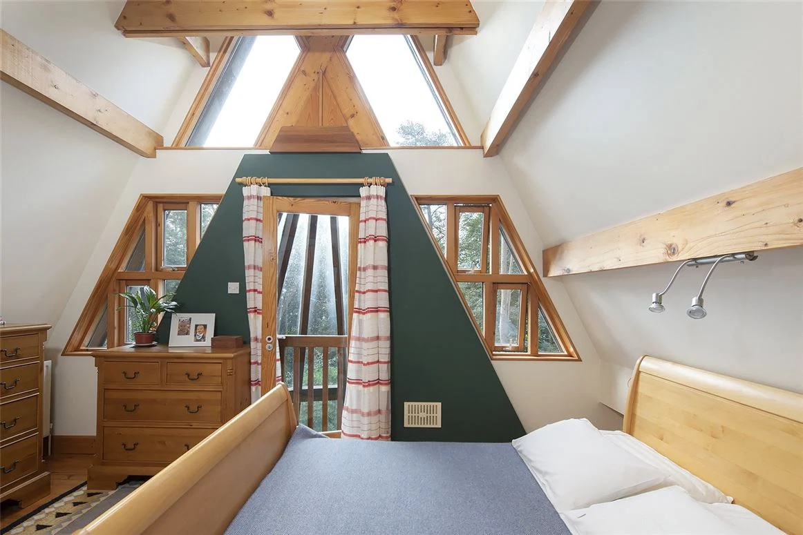 Split over a series of levels across three floors, you enter at the centre of the house, with a large, triple-aspect kitchen/living/dining space to the left that opens onto the glass conservatory. With two huge triangular dormer windows at either end, five-metre tall pitched ceilings and a wood-burning stove as its centre, it really does feel like you’re in the most spectacular treehouse. The conservatory does more than just create the perfect environment for a thriving grapevine too, collecting passive energy that heats the rest of the house.