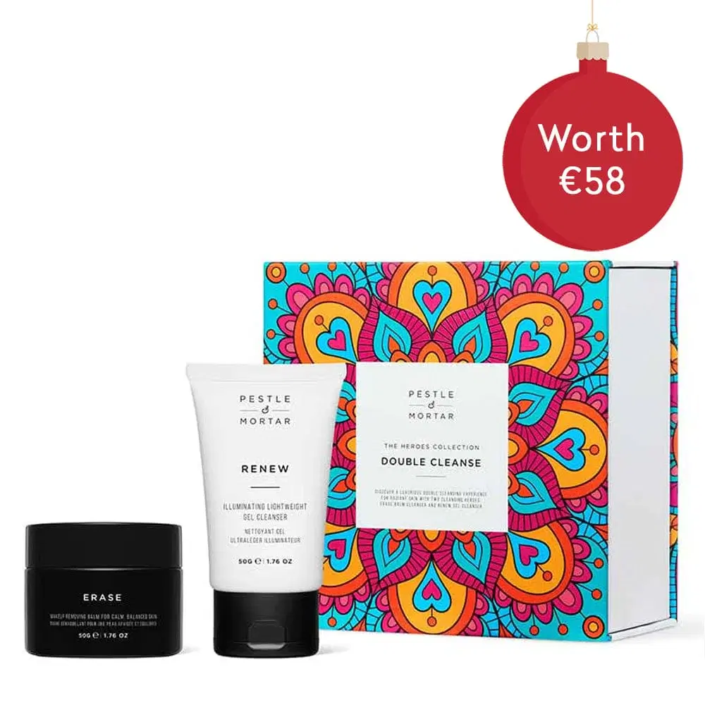 This kit contains a dynamic duo of Pestle & Mortar’s Erase Balm Cleanser and Renew Gel Cleanser, which work together to deeply cleanse, hydrate, and illuminate your skin, addressing dullness, clogged pores, and dryness. Elevate your skincare routine effortlessly with a refined complexion with tightened pores and improved skin tone and texture.