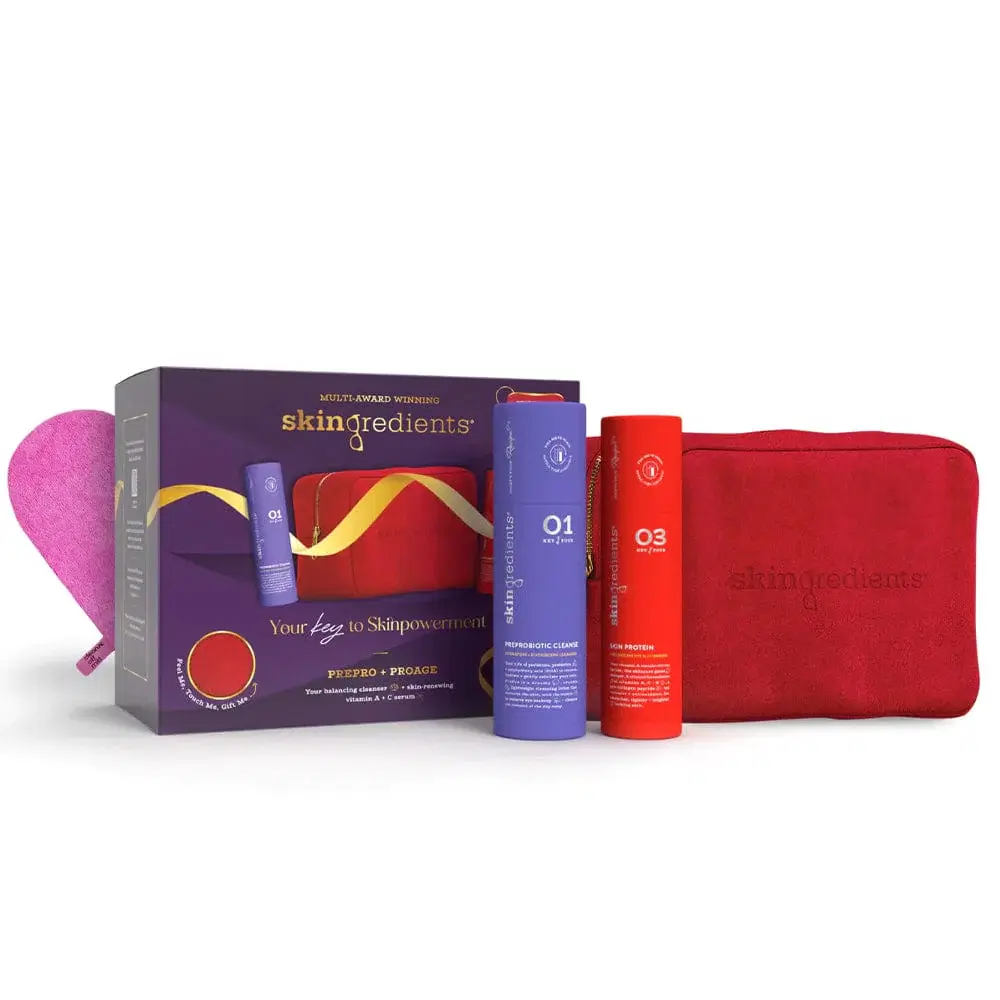 Bursting with skintelligent formulations, this restorative set contains PreProbiotic® Cleanse, a gentle daily cleanser that removes SPF, oil, debris and make-up with ease as well as giving back to the skin with its creamy, dreamy preprobiotic formula, AND the award-winning Skin Protein, a pro-ageing vitamin A and C serum that tightens, brightens and repairs the skin with visible results. It also includes a cleanse off mitt and luxury vanity bag.
