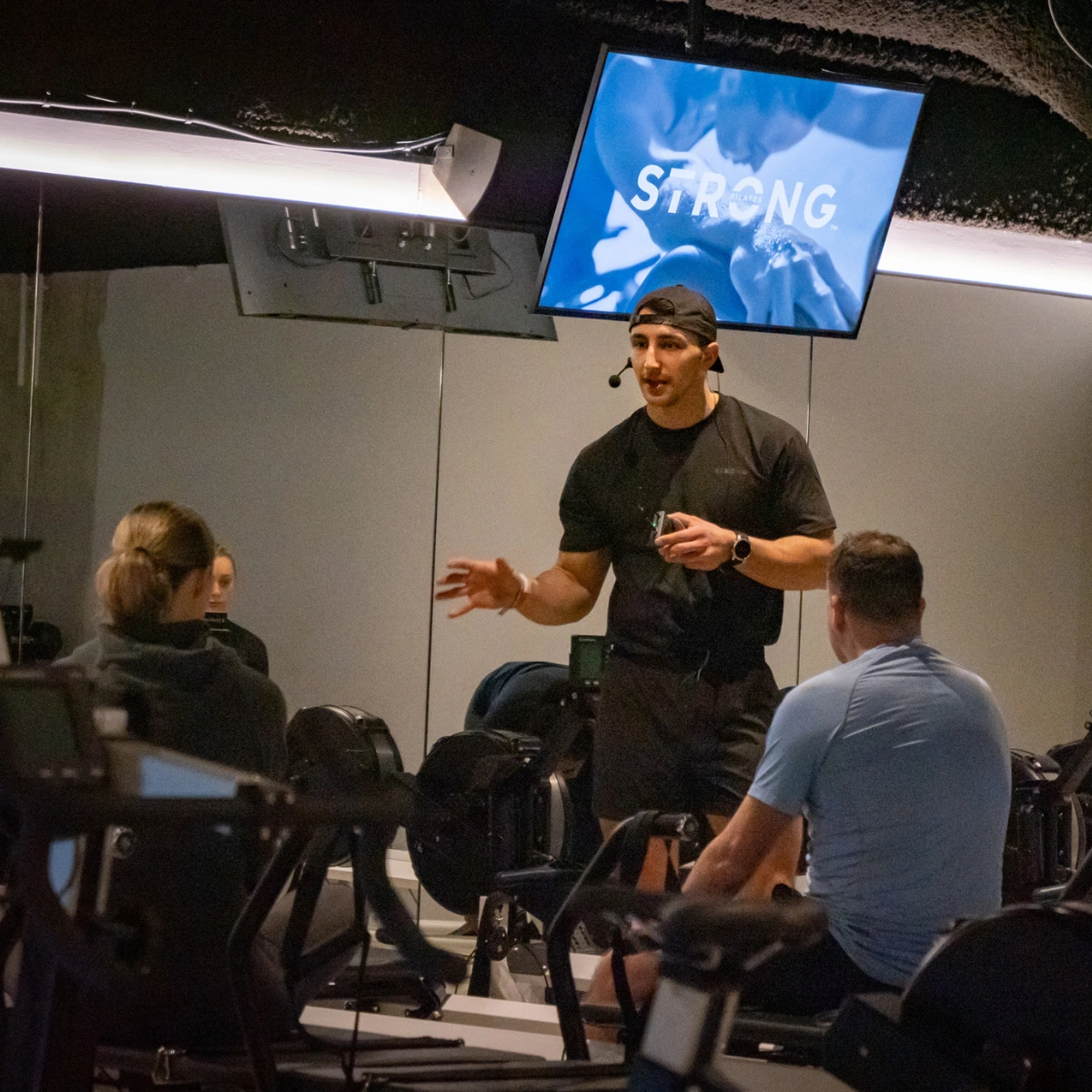 The studio space set-up is cool too, with a brushed concrete, industrial vibe, plenty of mirrors and helpful wall-mounted screens that demonstrate the moves as the instructor calls them out. Free weights are used throughout too, as you move between strength and cardio “erg-side” (indoor rowing machines are known as ergometers, hence the term “erging”, made famous in the brilliant Lessons in Chemistry). The Strong playlists are always adrenaline-inducing and I love it when they dim the lights, and raise the volume for the erg element. At the end of class, when even your elbows seem to be perspiring, the trainer hands around a tray of chilled face towels, straight from the fridge, infused with refreshing eucalyptus oil. Divine.