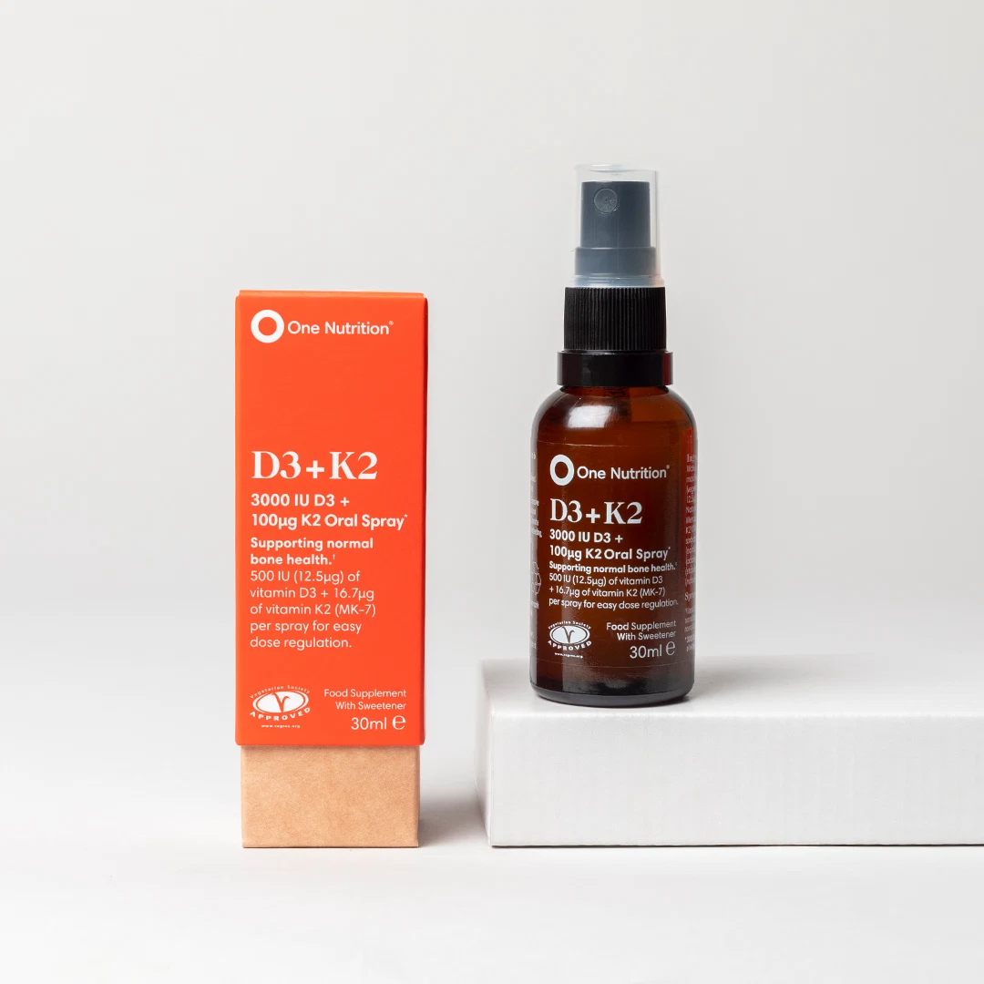 One Nutrition D3+K2 spray is a tasty, highly absorbable spray which contains Vitamins D3 and K. Vitamins D3 also contributes to the maintenance of healthy bones, immune support and calcium absorption. The spray also makes it easy to give a precise dose: 6 sprays delivers 3000IU of Vitamin D and 100g of K2.