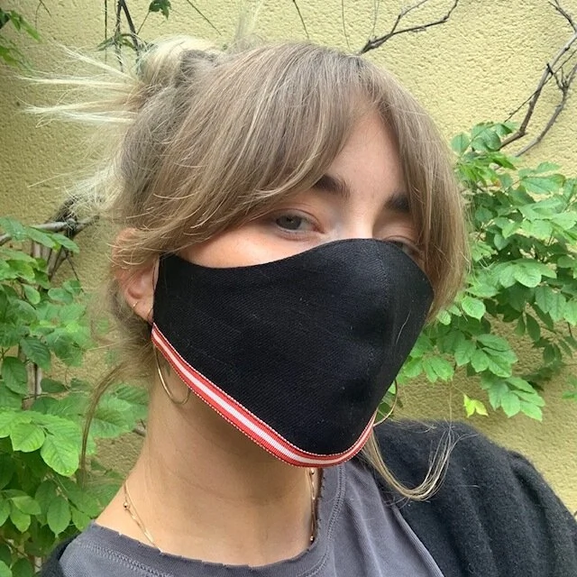 Sold and modelled by Domino Whisker, these linen face masks with vibrant trims are designed and made by her mother, Mariad (the entire family is embedded in the culture of Irish design).