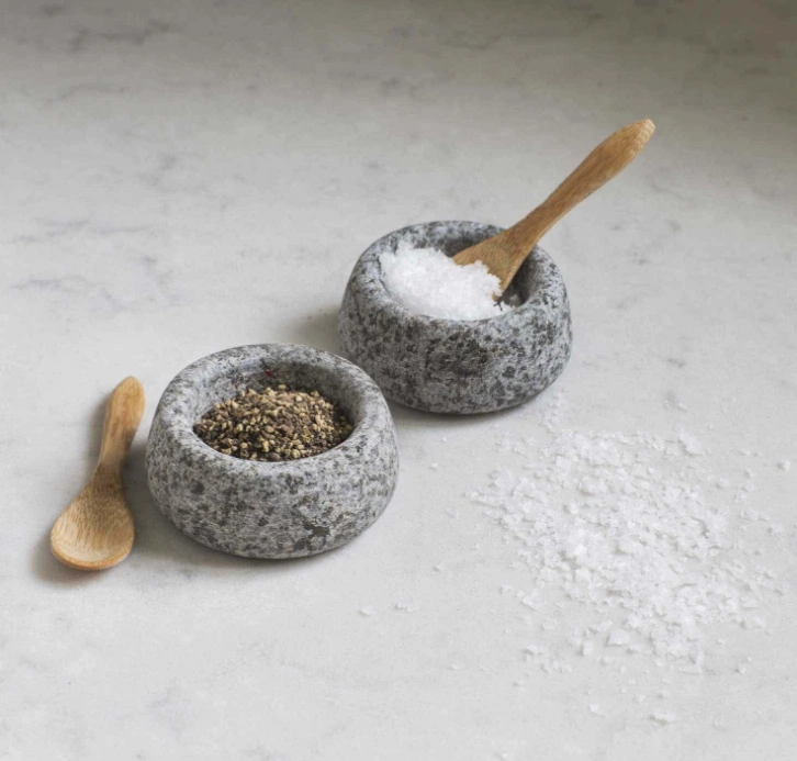 Set of granite salt and pepper bowls with spoons, The Blue Door, €18