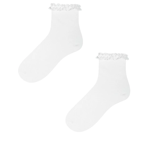 With frilly socks and a dress