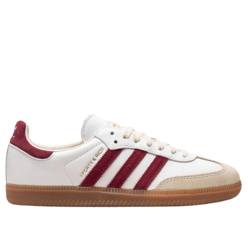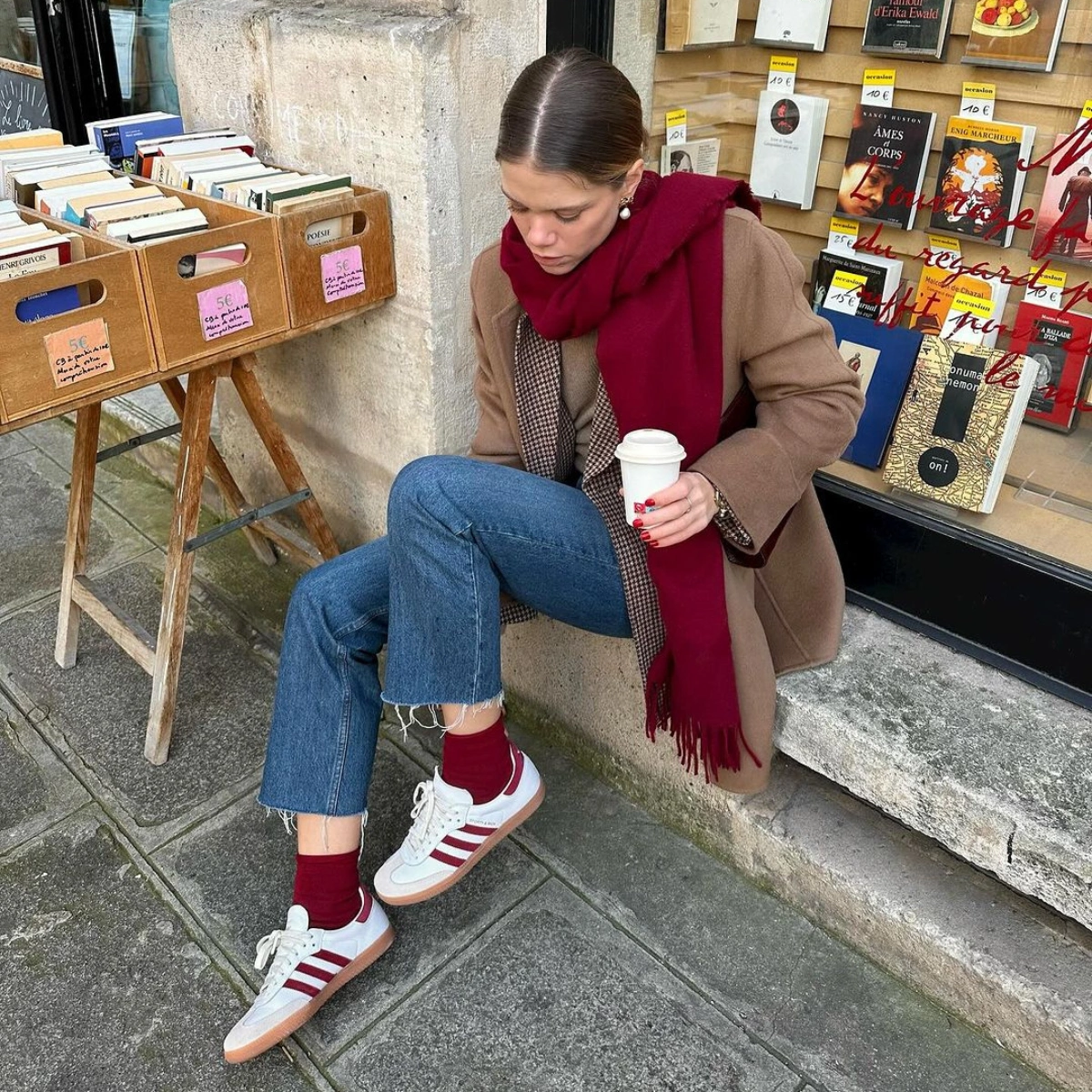 Red socks couldn’t be more on trend at the moment and jeans? Well, denim never goes out of style. Above, Parisian fashion influencer Elodie Romy styles her adidas x Sporty Rich Sambas with coordinating burgundy stocaí and a matching scarf. The jeans and wool overcoat keep the look casual but sophisticated.