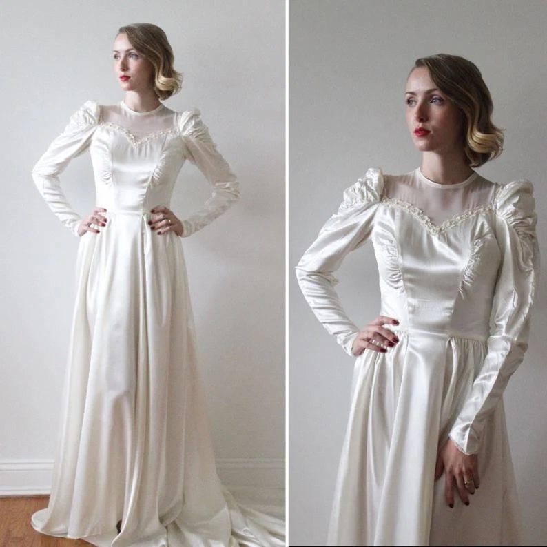 Vintage 1940s satin long-sleeved wedding dress with illusion neckline, size S, €363 from MirandasBridal
