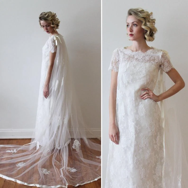 Vintage 1960s short-sleeved lace wedding dress with detachable tulle and lace cape train, size S, €323 from MirandasBridal