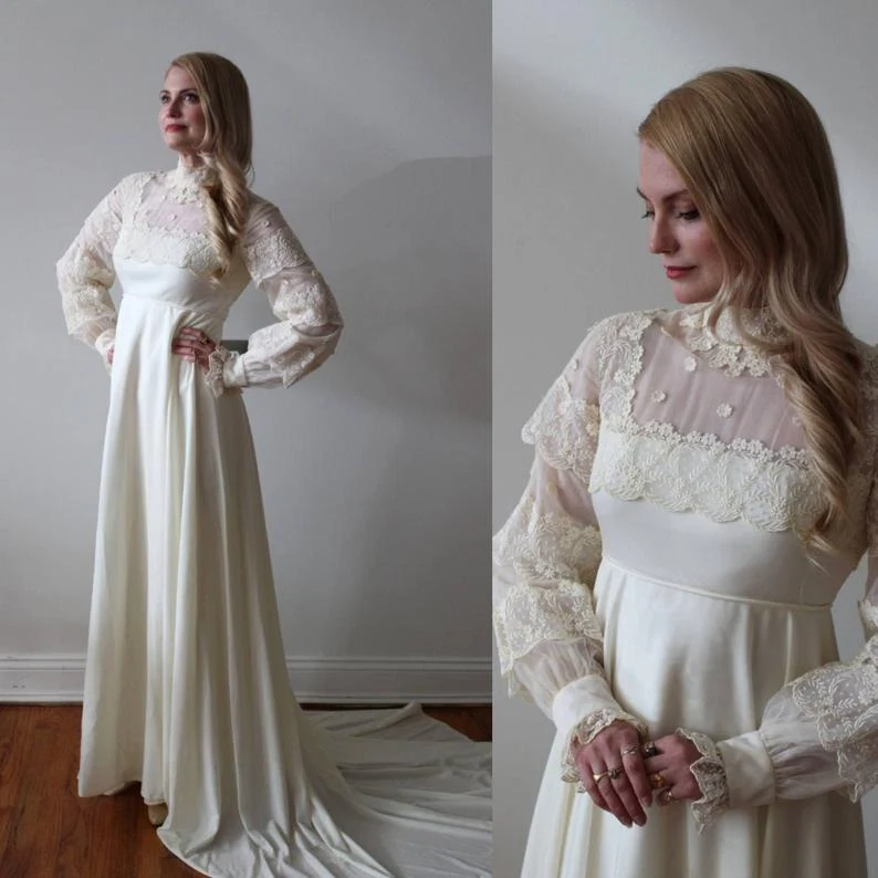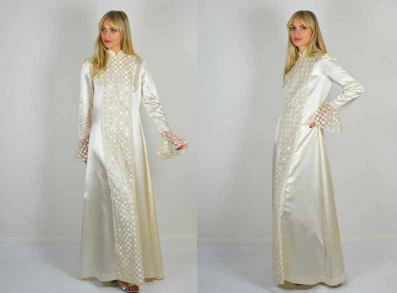 Vintage 1970s ivory satin lace long sleeve wedding dress, size 12, €173 from TheVintageBridesClub