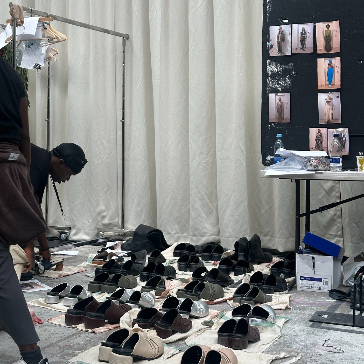 Yesterday, we prepped the space and confirmed all 34 looks. I’ve got three incredible backstage lead dressers: Ngozi Elobuike, Benn Waigand, and Clara Murphy, each with a team of backstage volunteers. My first task is finalising the polyboards: each model’s look, a reference image, and their polaroid lined up like a visual bible for the day ahead.