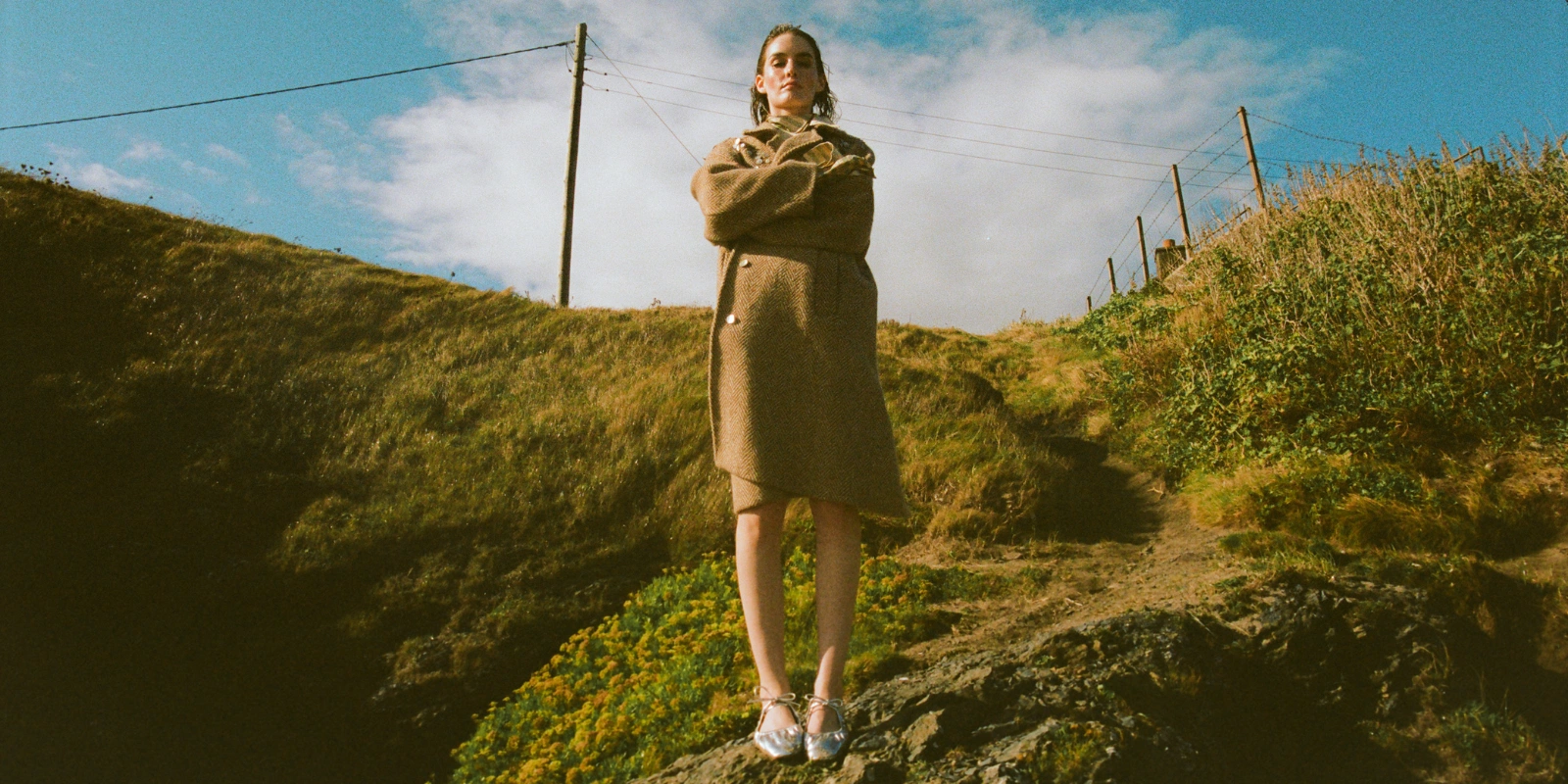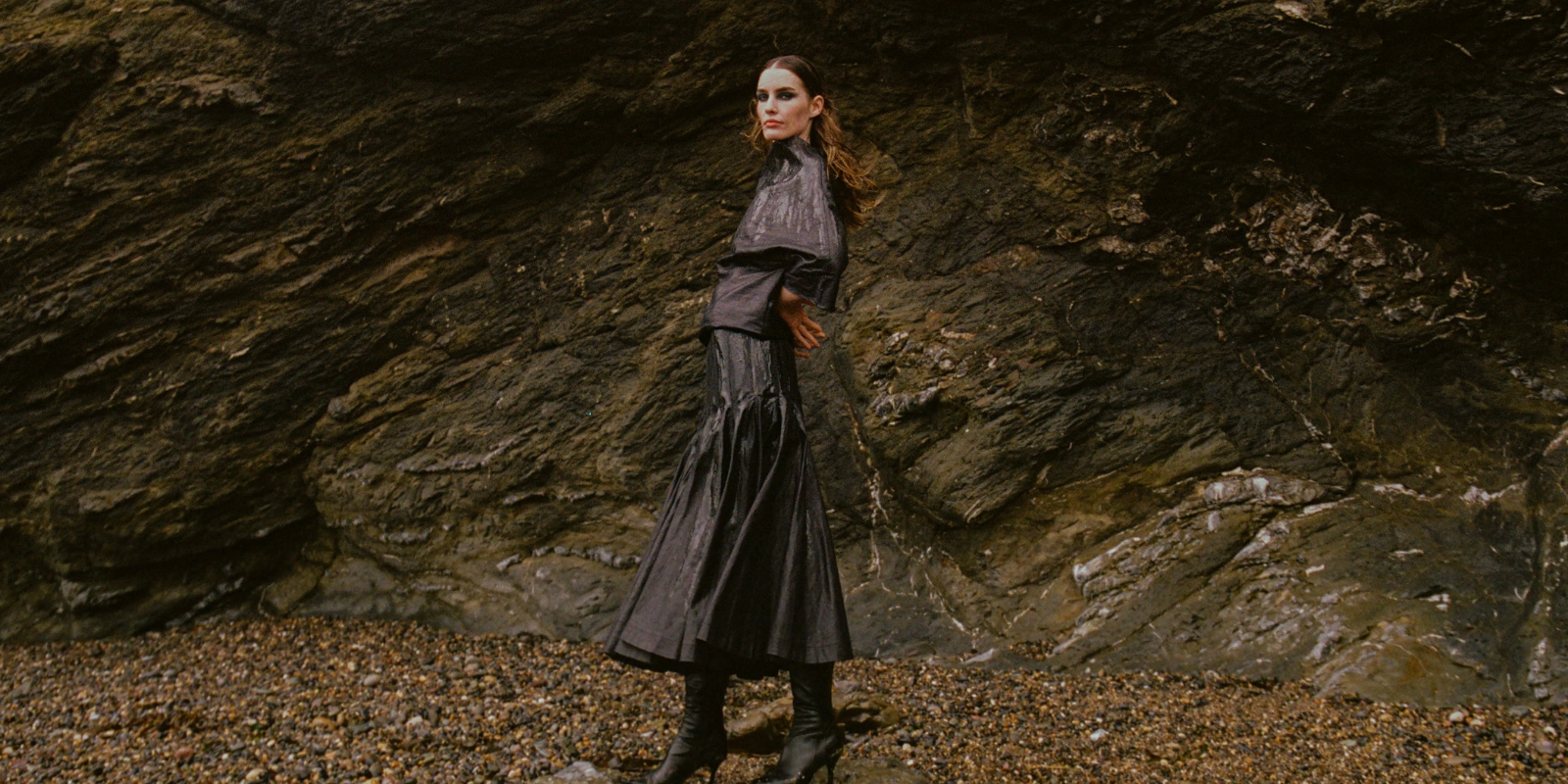 I started thinking about the sound of the waves, grey skies, miserable, damp landscapes, which started to build a palette of sandy tweeds adorned with pearlescent buttons, shredded seaweed knits and dark, twisted silhouettes that control around the body.