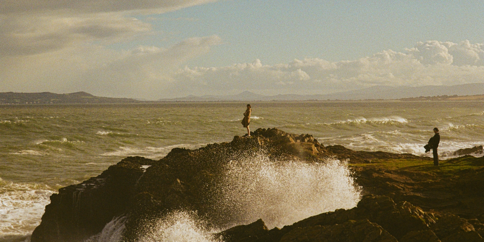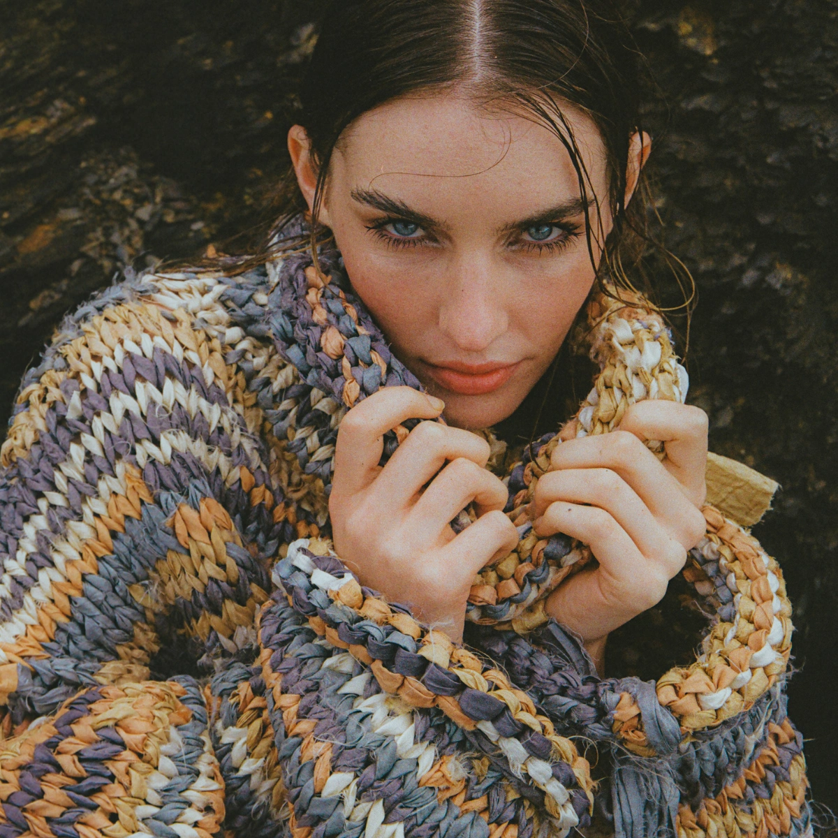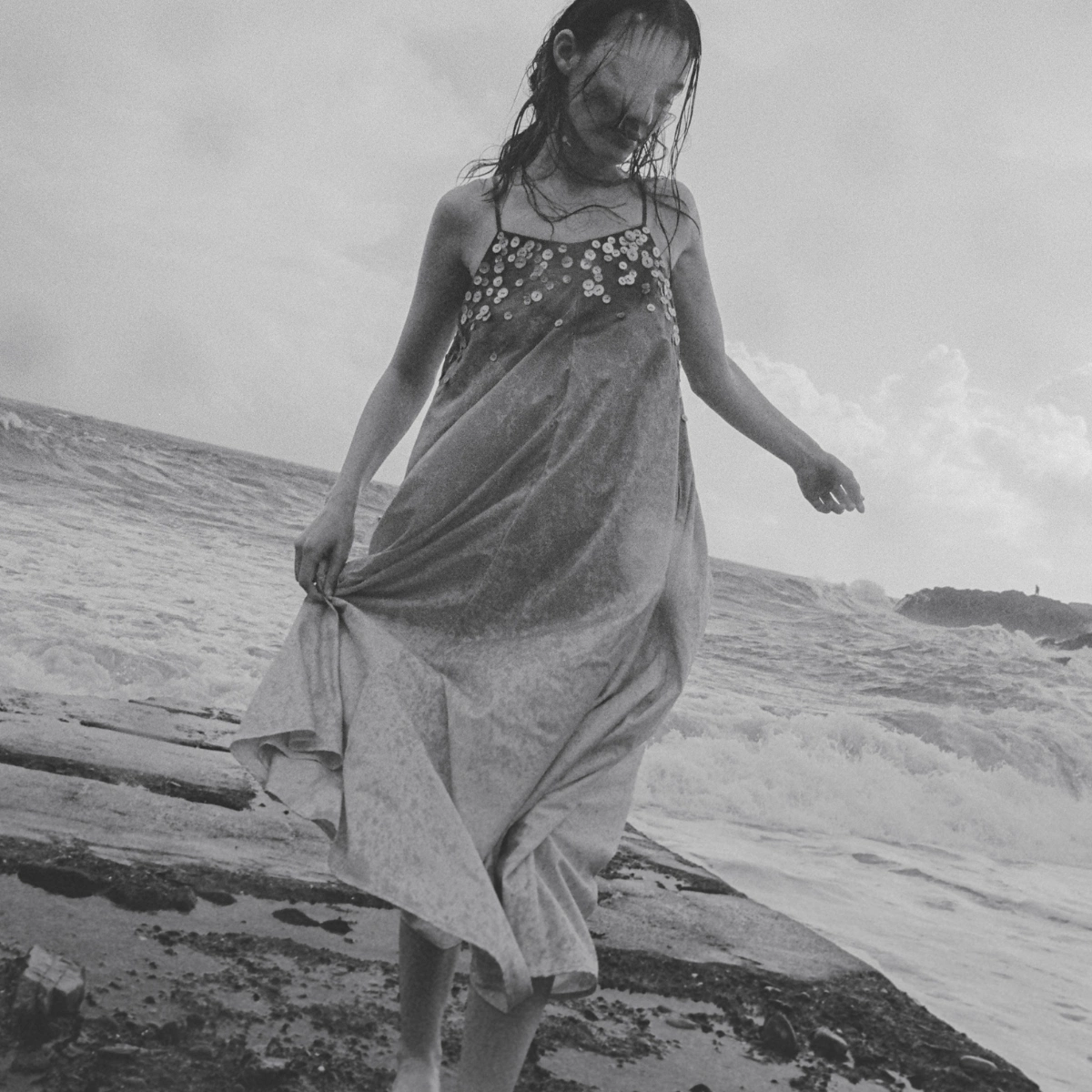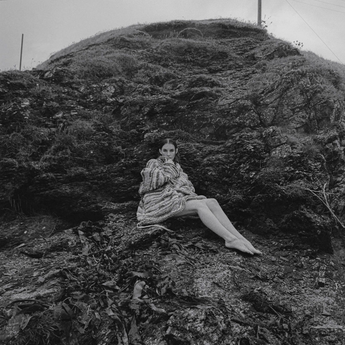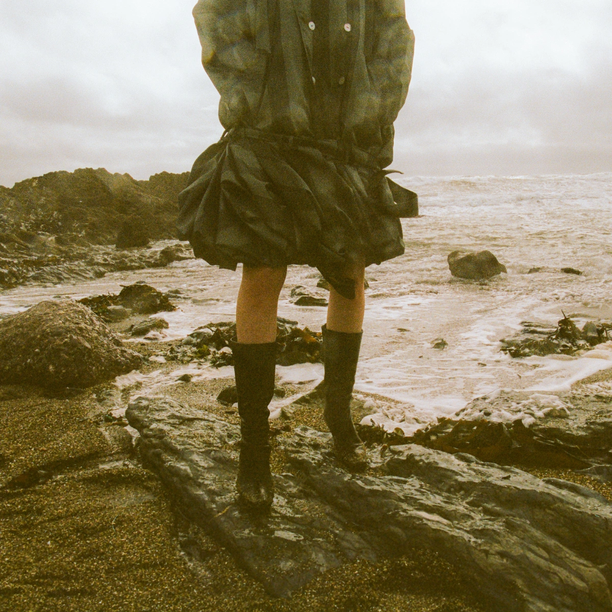 At that time, I spent time with my own melancholy and sadness, which fostered introspection and reflection. I live in a small, quiet border town, which is right on the border between Northern Ireland and the Republic of Ireland. I found myself escaping to a shrine near my house by the water’s edge. I started thinking about the sound of the waves, grey skies, miserable, damp landscapes, which started to build a palette of sandy tweeds adorned with pearlescent buttons, shredded seaweed knits and dark, twisted silhouettes that control around the body. I was also looking at Ingmar Bergman’s Persona, where the female protagonists escape to a cottage by the sea. A lot of my design process comes from a feeling that carries me through.