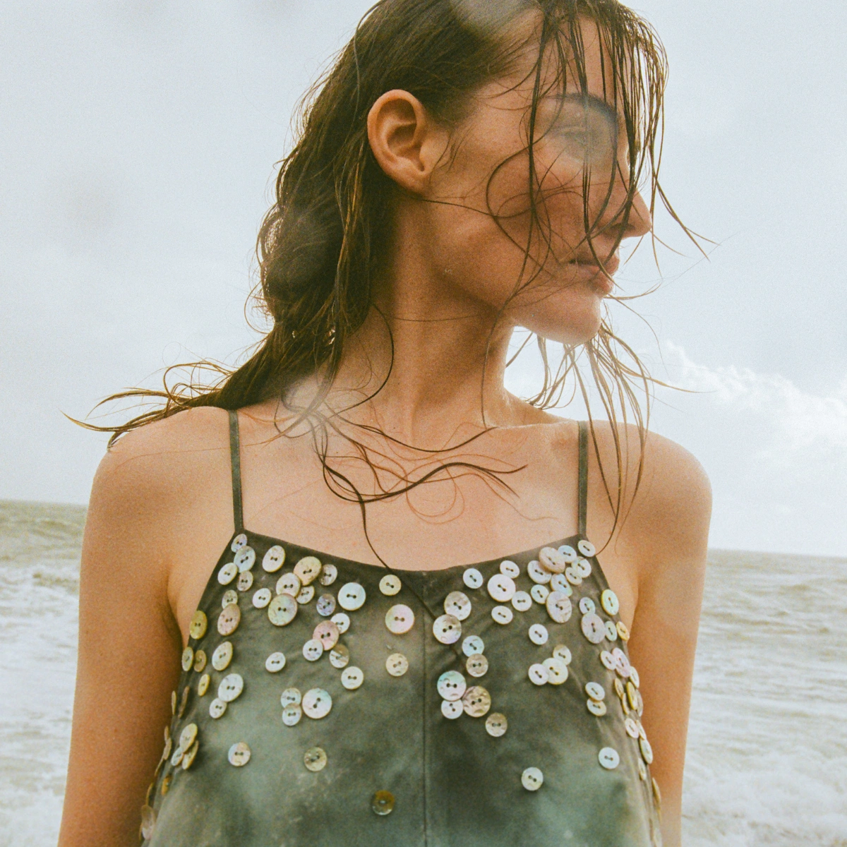 Entitled ‘Persona,’ the 27-year-old was inspired by Ingmar Bergman’s 1966 film Persona, and a personal tale of introspection following his return to Ireland after living and working in London. McCabe channeled his elusive inspiration into an emotive 16 looks: a tweed coat embroidered with pearlescent buttons pays tribute to the Irish landscape and craftsmanship; a hand-dyed cotton poplin slip dress with a metallic sheen, adorned with mother-of-pearl buttons, and silk yarn knitwear evokes a sleepy seaside town where he lives. The collection will be available through private orders with a small e-commerce offering to follow in January.