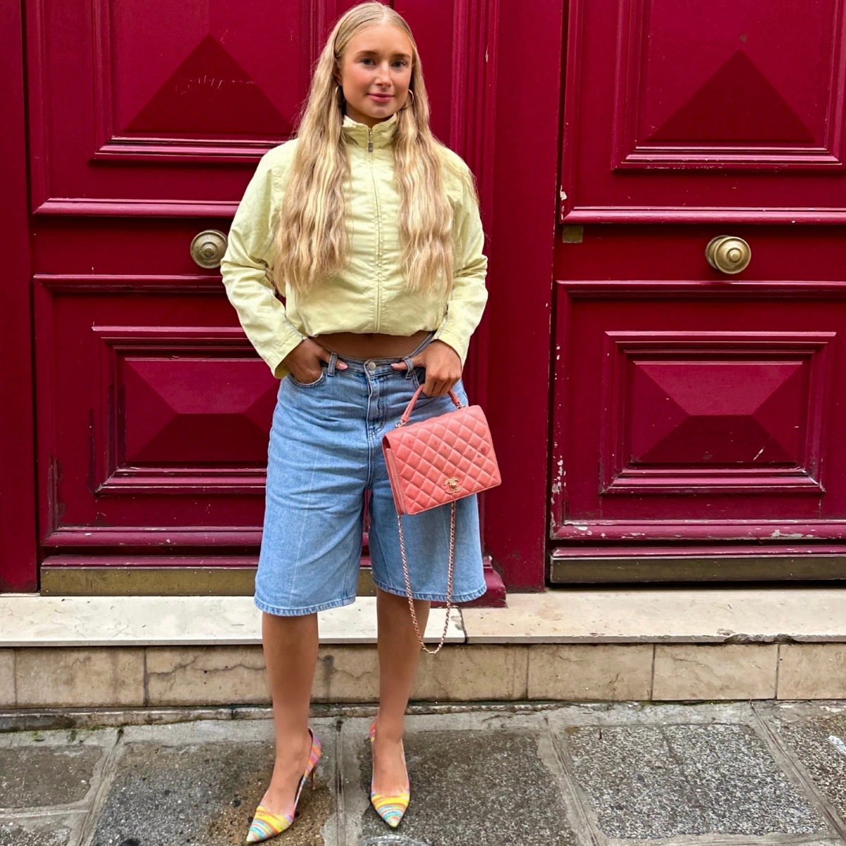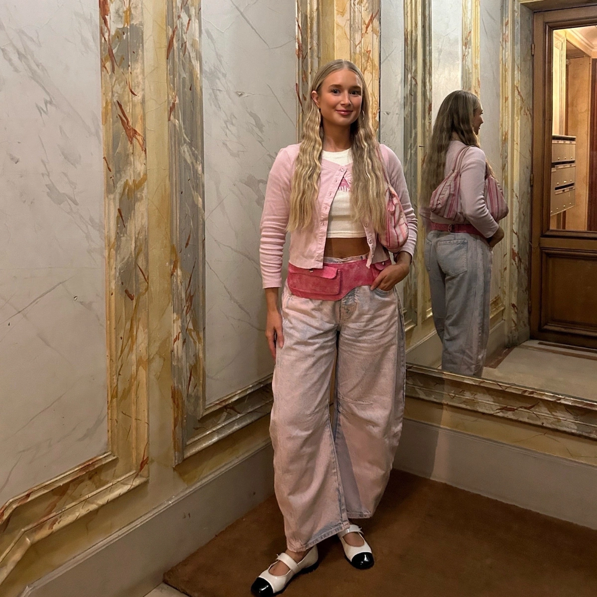 For me it doesn’t matter what season it is, I will never not love an all-pink look! I wore this on the most miserable day of the week (by the way don’t move to Paris for the weather) and it actually made me feel so much better. We are back with the Free People barrel jeans in this pink shade (obsessed), paired with a little pink cardi, a fun tee, my Chanel Mary Janes and my denim pink Gimaguas belt, my favourite accessory I think I have ever bought.
