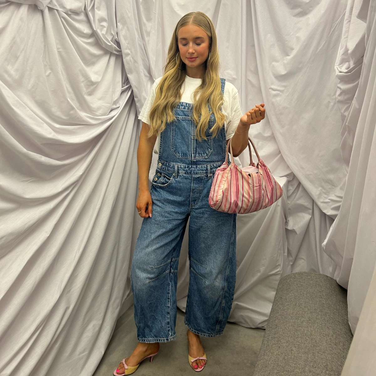 Of course, I will always have a major denim moment. I’ve been loving the barrel jeans trend, and these Free People dungarees had been on my wishlist for a while. I’ve been living in them since I got them! They’re such a fun twist to an otherwise pretty simple look, and really flattering on a lot of body types too. I paired them with cute vintage kitten heels and a pop of pink, to add a little feminine touch. Ignore the closed eyes – it’s been a long week!