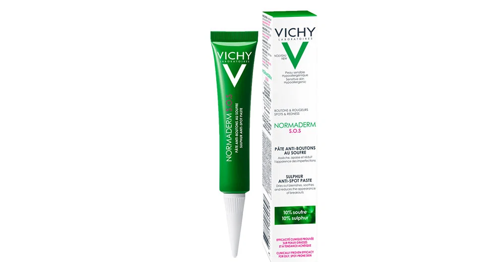 Vichy’s Normaderm S.O.S Sulphur Anti-Spot Paste Normaderm SOS Sulphur Paste (€13.12) is a targeted care clinically proven to reduce the appearance of blemishes. Enriched with 10% sulphur, niacinamide and glycolic acid, the sulphur paste reduces the appearance of pores and instantly targets the appearance of blemishes with a drying action.