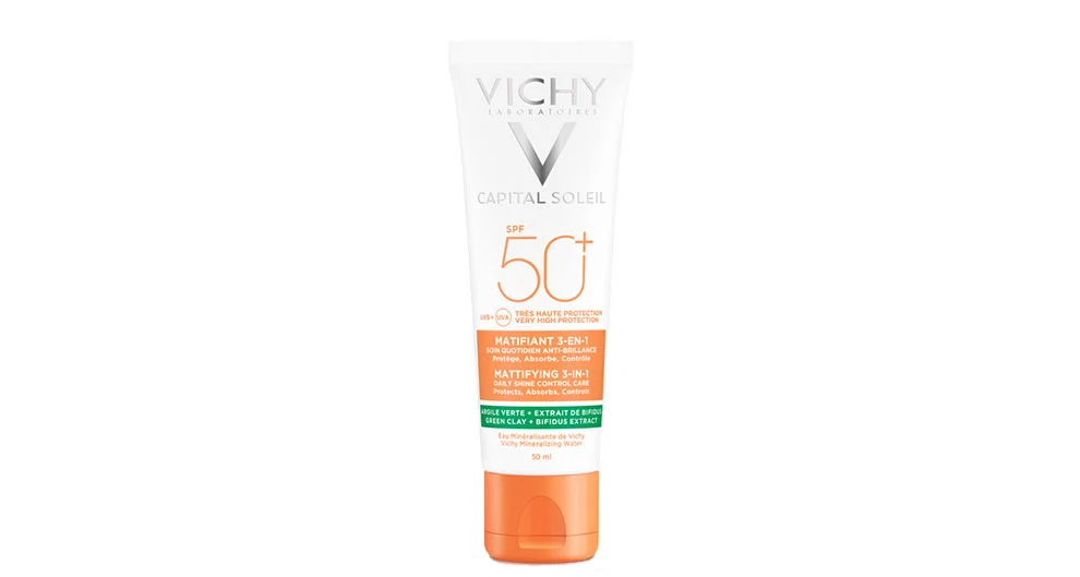 Vichy’s Capital Soleil Mattifying 3-in-1 SPF 50+ (€13.12) is enriched with green clay that provides broad spectrum UVB and UVA protection while absorbing excess sebum.