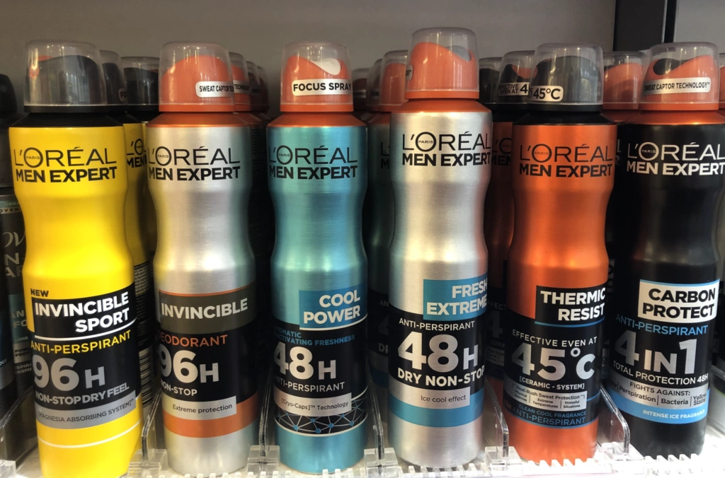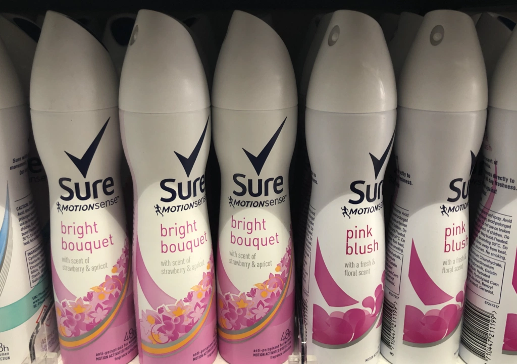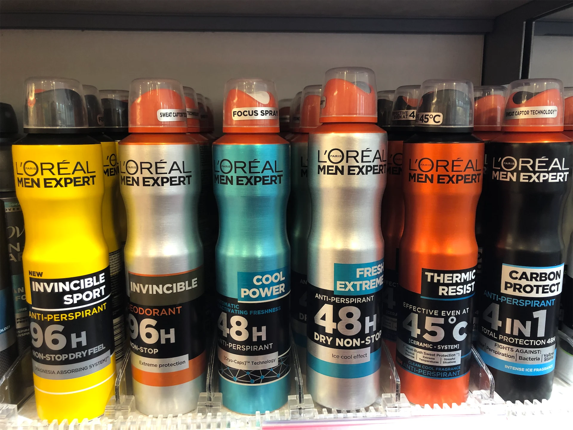 Let’s take, say, deodorant. Men are offered power, invincibility, THERMIC resistance and CARBON protection. Giant numbers state just how effective it is, there’s block lettering and phrases like “Fights against” and “Extreme protection” and words like “technology” and “system” – because obviously, men like things to be aggressive and statistical and PROVEN.