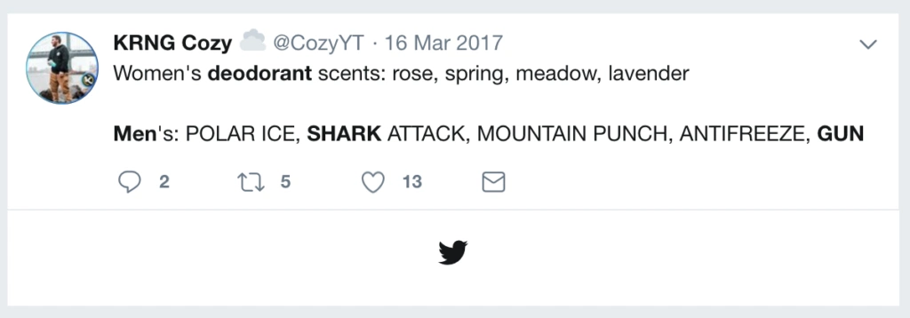 It’s true, the beauty industry has made some pretty funny, sweeping decisions about what men and women want from their beauty packaging. And what if you don’t particularly identify with either set of messaging, or indeed with either gender. I’m not attempting to validate these generalisations here, or change them in any way – they are what they are – but I just find it really entertaining. This tweet was the first time I really took notice of it: