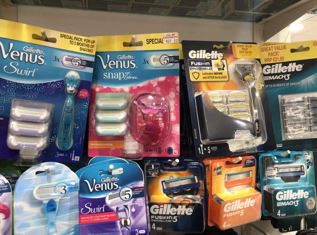And as for regular razors? The differences are hilarious. Here, the guys are presented with MACH III and Fusion 5, Pro Glide – which, let’s be honest, sound like models of aeroplane from Top Gun or maybe weapons of some sort. And for the ladies?! Venus Embrace, and the gentlest of all… the Swirl.
