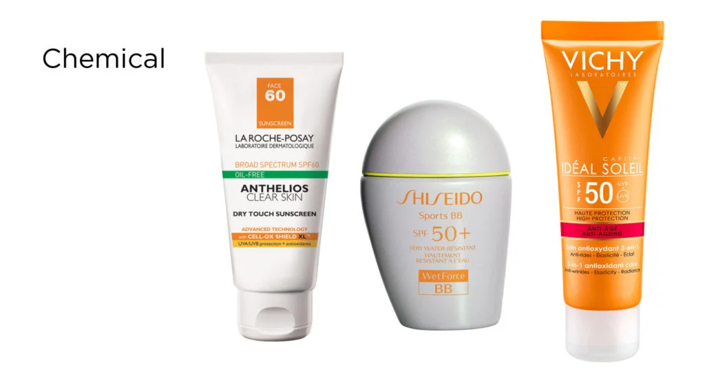 The main difference between chemical and physical (also known as mineral) SPF is that with chemical ones, the UV rays are absorbed but converted by the SPF into being non-harmful. Whereas physical/mineral SPF reflects the UV rays so they don’t enter your skin at all, and contain things like zinc oxide and titanium dioxide to block the sun’s damage. Both work well, but both have their downsides.