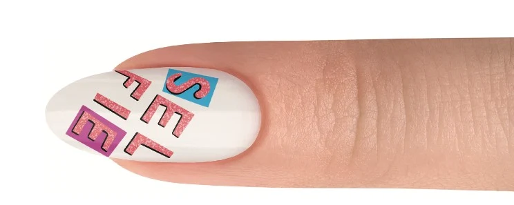 Using a pink shade (shade used: Me, Myself-ie And I) and a striper brush, start drawing the word ?SELFIE?. Begin with the letter E so that it’s easy to balance. Cure for 5 seconds. Next draw the letters S and L. Flash cure for 5 seconds. Continue drawing the letters F, I and E. Cure for 30 seconds.