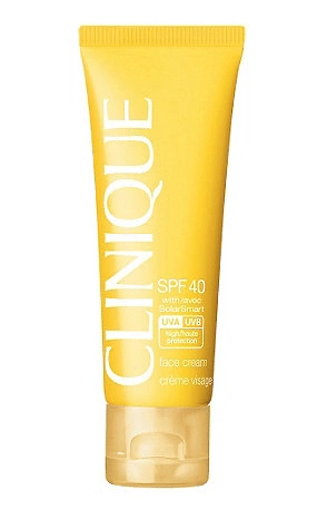Your face is constantly the most exposed part of your body and UV rays will cause aging and wrinkling, as well as the risk of skin cancer. Start with a SPF 30 sun cream, made especially for the sensitive skin on your face,’such as?Clinique Face Cream Spf40 for €23.00 @ Debenhams.