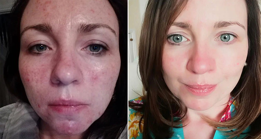 Lisa Kidney, on the left, before using the Kennedy & Co Purifying Peat Face Scrub, and on the right, after three weeks of use. Photo: Supplied