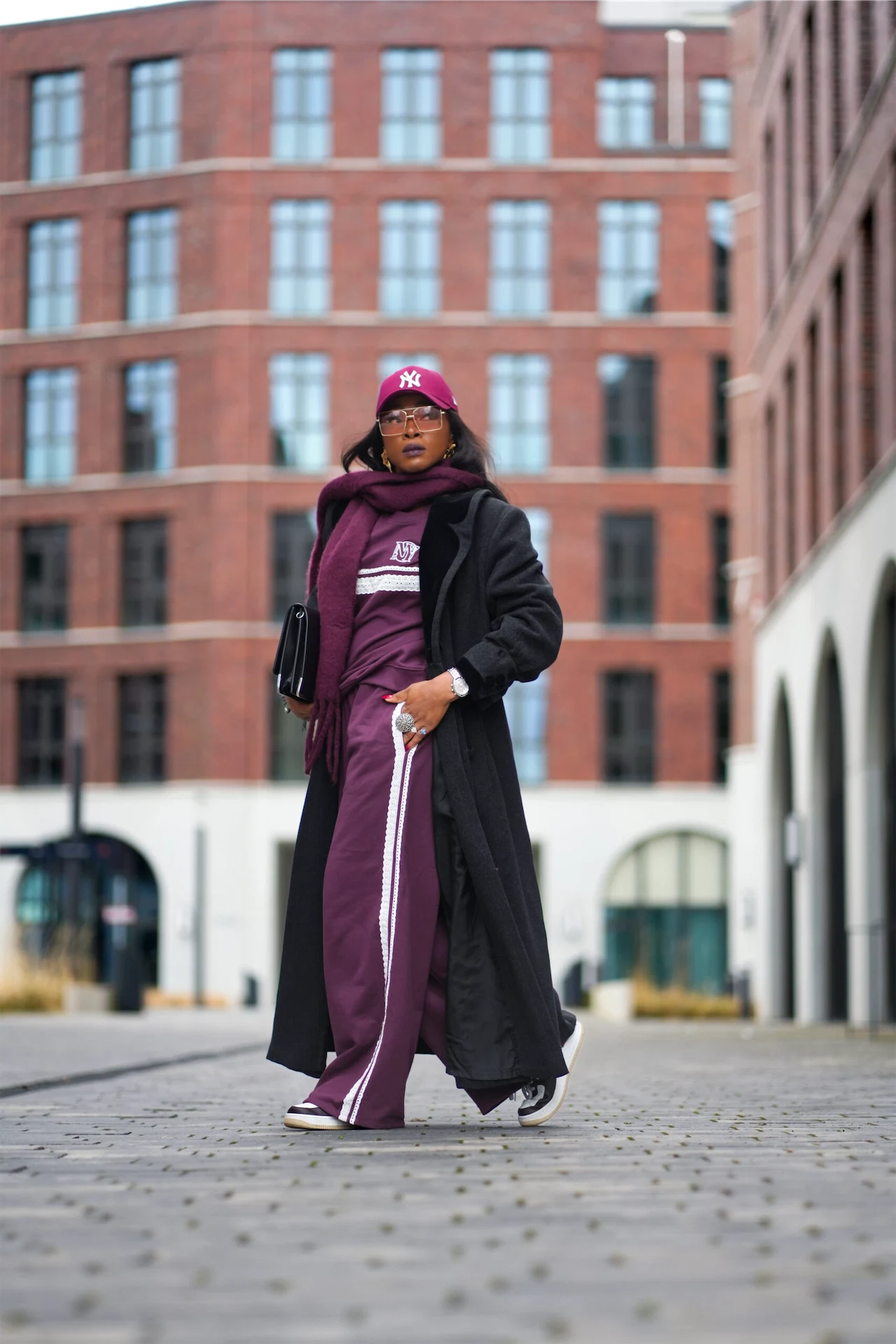 Early morning flights are never glamorous, but I believe in effortless travel style. I boarded my flight in a burgundy Zara tracksuit, layered under a vintage black coat—a balance of cosy yet elevated. Paired with Nike sneakers, a matching hat and scarf, and oversized sunglasses, I was set for a seamless transition from airport to city streets. The icy Berlin wind greeted me with a sharp reminder: fashion week waits for no one.