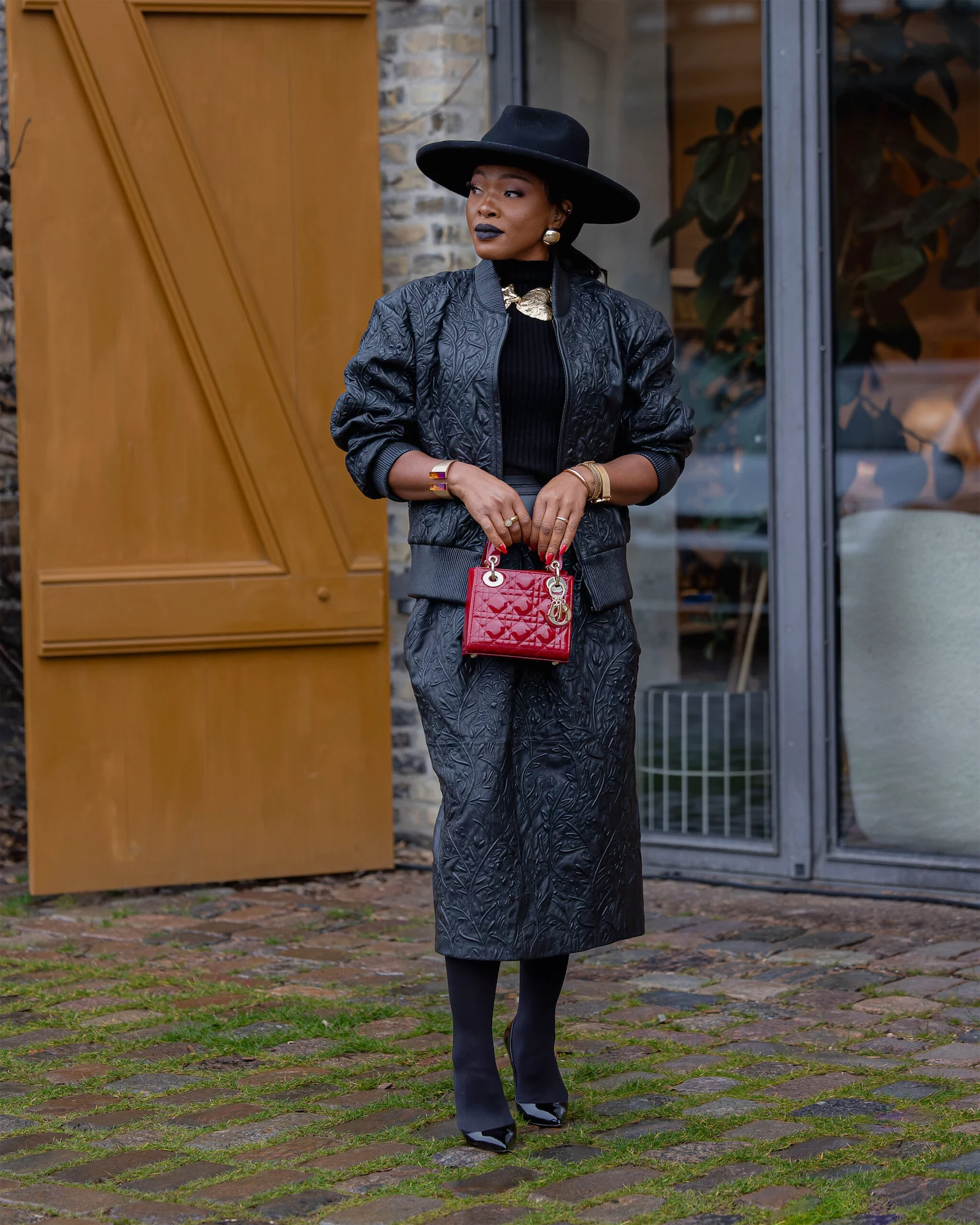 First, a luxurious Munthe set, styled with my black thebuckshat fedora, Christian Louboutin pumps, and a red Dior bag—the texture of this set is something you have to feel to believe. The second? A statement piece from Hertunba, one of my favourite Nigerian brands, paired with—you guessed it—a fedora.