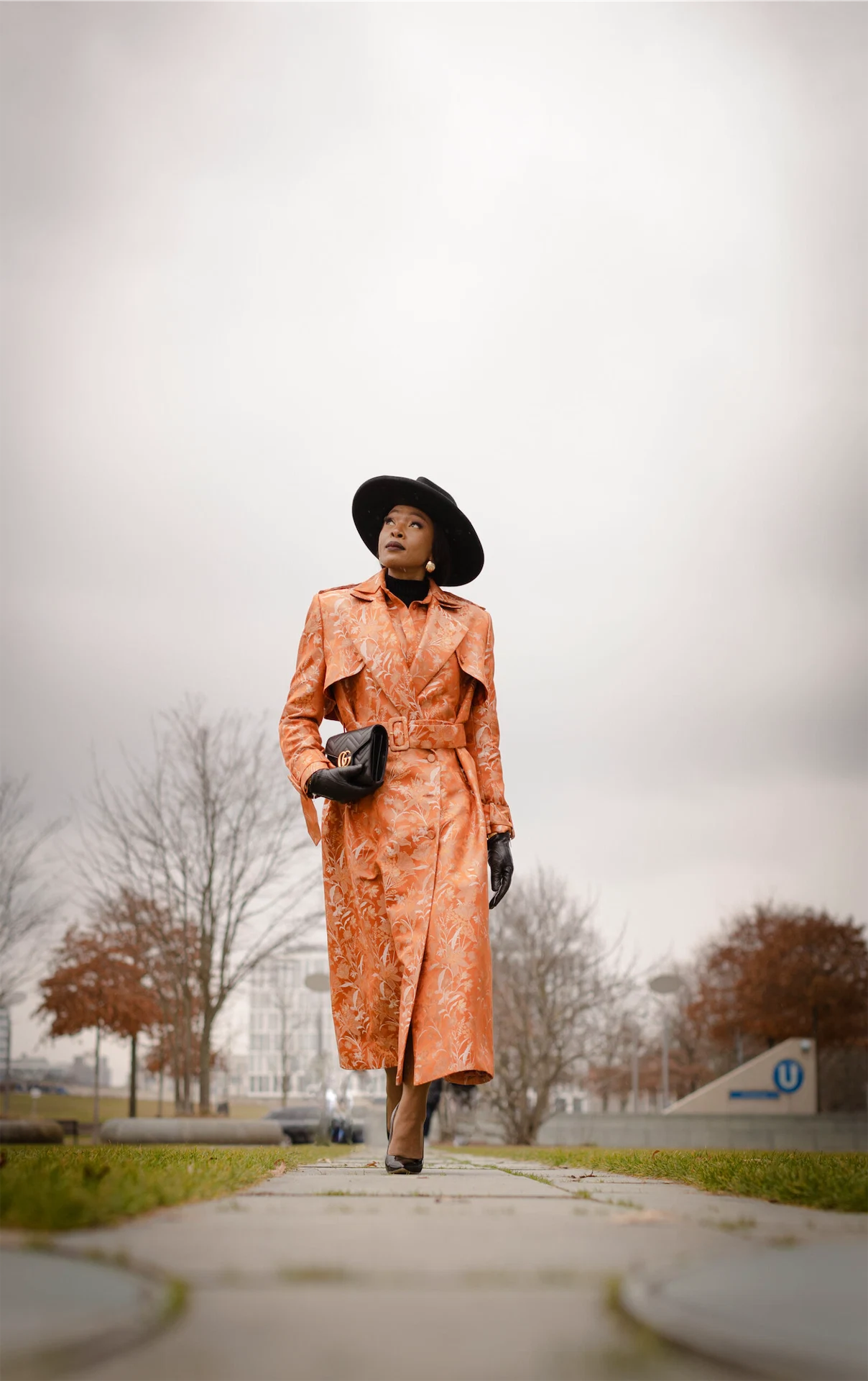 After settling into my hotel and grabbing a quick lunch at a nearby local cafe, I slipped into my first look for Berlin Fashion Week—a stunning coat from Danny Reinke, which I styled as a statement dress. The boldness of the piece called for equally strong accessories: a thebuckshat fedora, Guess pumps, and a Gucci bag.
