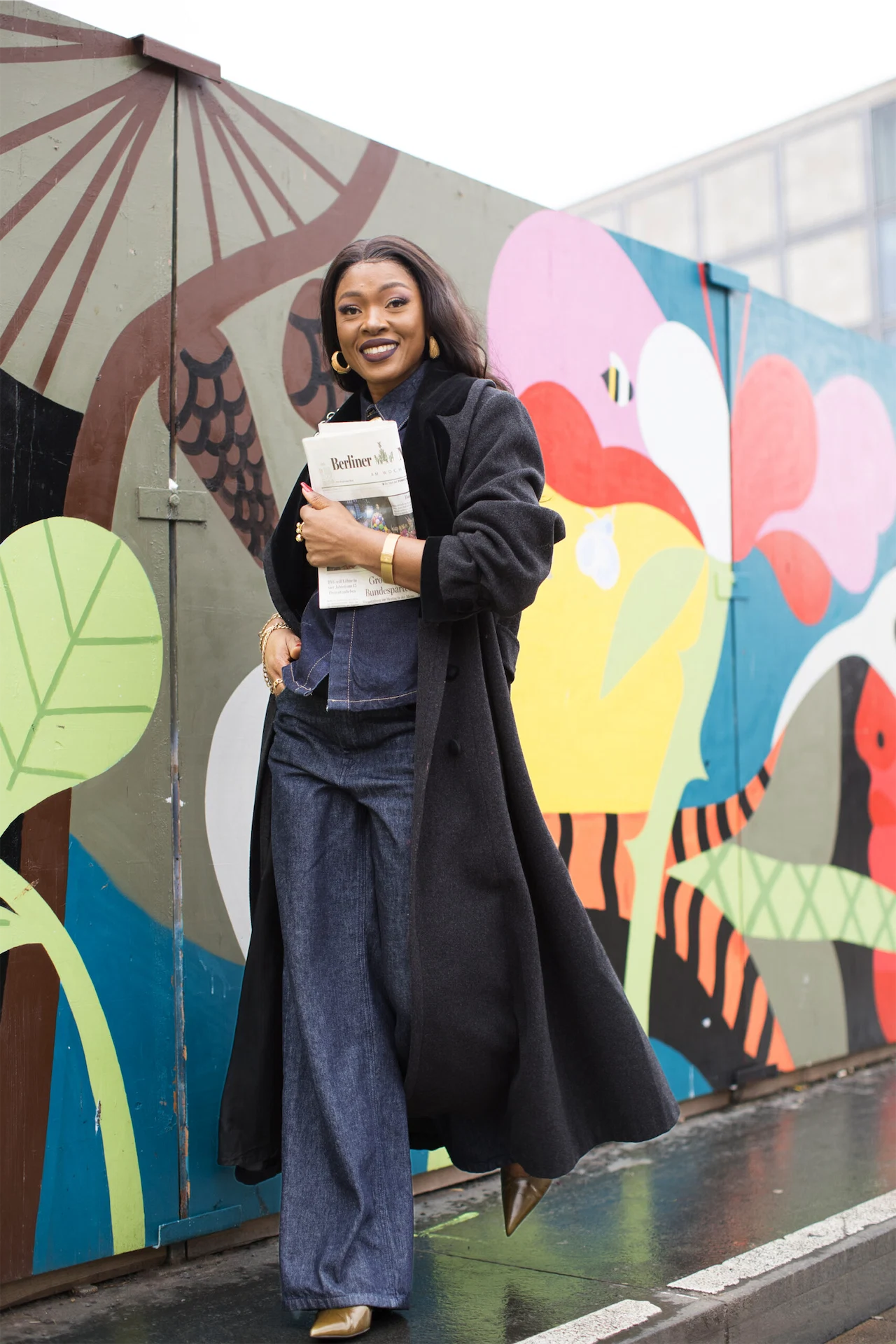 For a day of shopping and brunch, I chose an all-denim Zara ensemble, embracing the dark-wash Canadian tuxedo trend. The button-down top made trying on clothes effortless, and I layered it with my vintage black cashmere coat that I purchased years ago from a vintage shop in Köln. Accessories were key: olive Zara heels, layered gold jewellery, and my pre-loved Fendi bag – the ultimate carry-it-all essential.