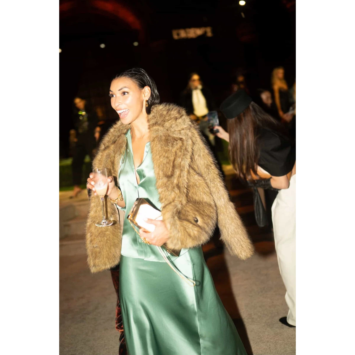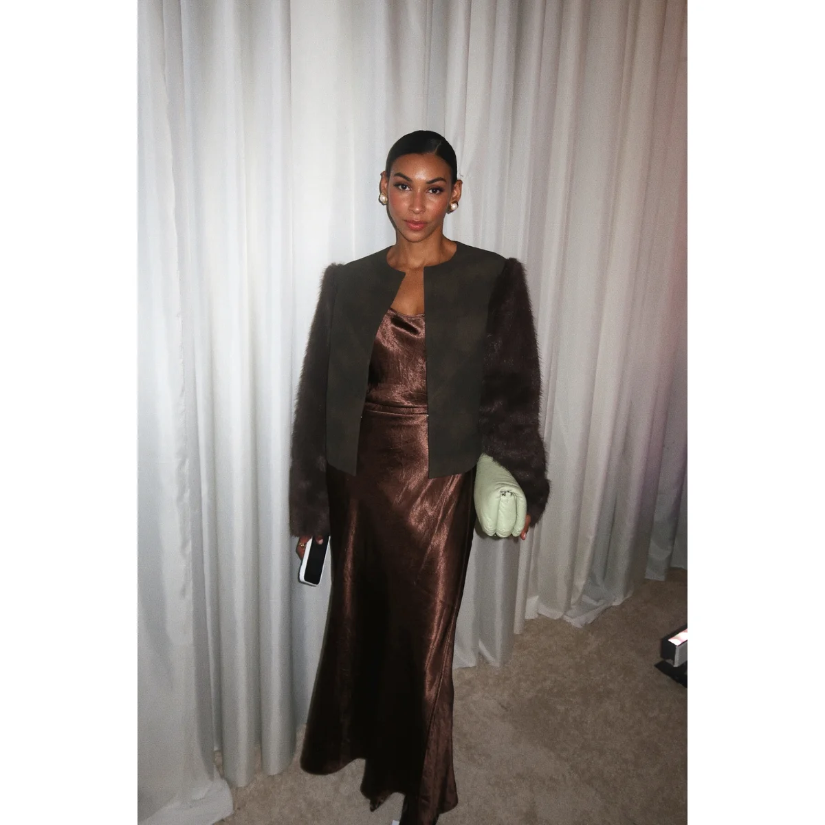 In the evening, I chose Janet Howard again, but this time in the form of a satin dress and jacket with faux fur sleeves. I styled it with a Loewe bag and Zara heels. I love mixing high fashion with