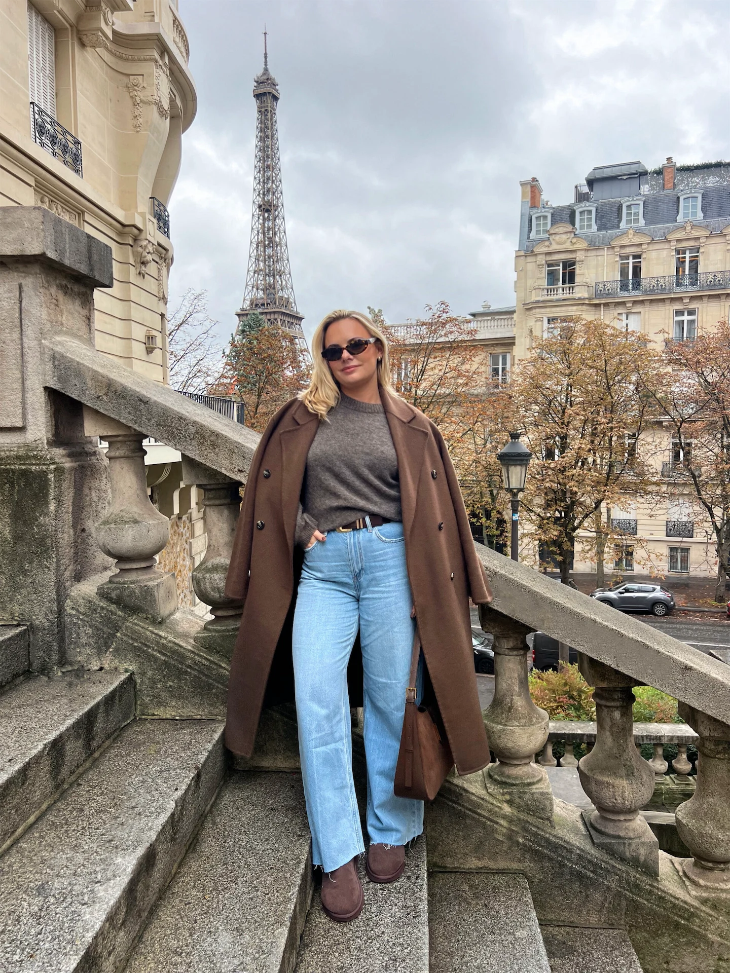 Bonjour! We arrived in Paris for a mini city break and some content shooting. I wanted to style a few chocolate-brown outfits, and this was look one. I found a pair of brown Uggs during the week that I couldn’t wait to wear alongside my new suede Demellier bag. I wore a Mango coat, an &Other Stories knit (non-itchy!), and Abercrombie jeans. When I wear oversized pieces, I always go for some waist definition, so I don’t get lost in the clothes. I tucked in the jumper and added a belt to balance the wide legs and oversized coat.
