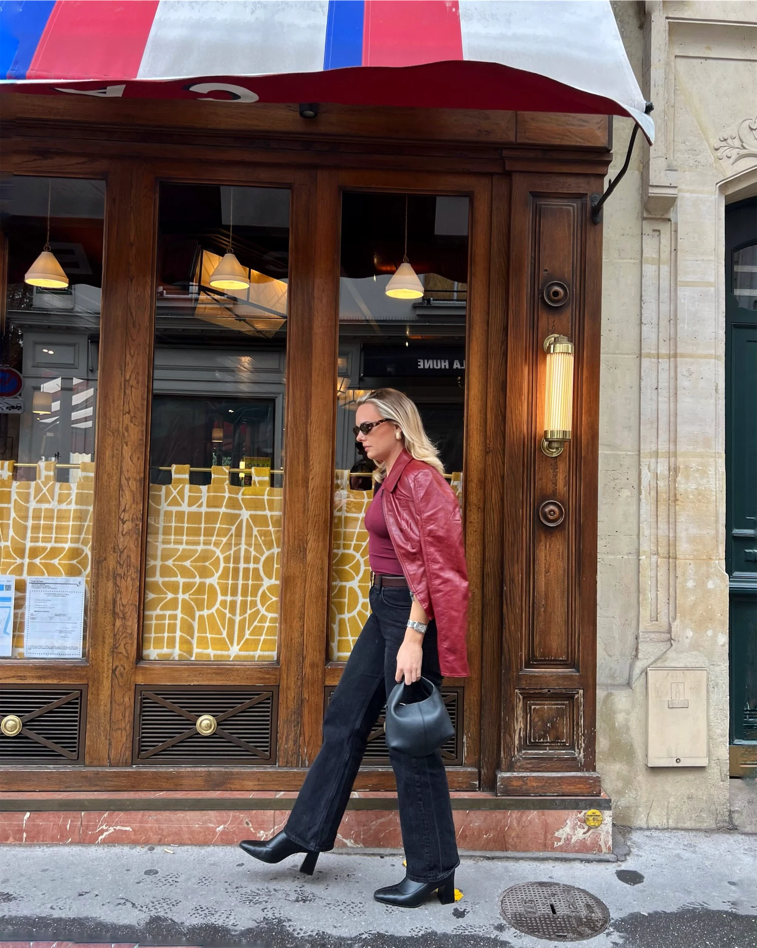 Lunch look! I spent the morning filming some beauty content in the hotel – we stayed at Le Grand Hotel Cayré and the bathrooms were so gorgeous, I had to take advantage. Afterwards, we wanted to grab lunch and do some Fashion Week people-watching. I went for this burgundy faux leather jacket which was an ASOS find with a matching tank and another pair of Abercrombie jeans.