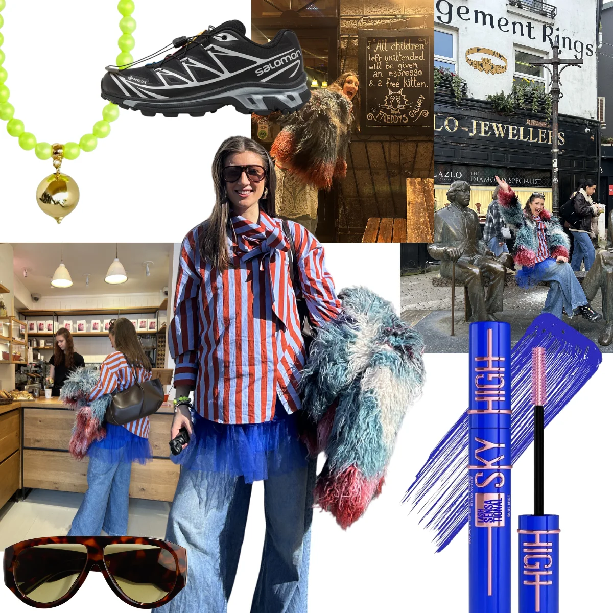 I wouldn’t go anywhere without The Smooth Company Dream Cream, I actually popped into Brown Thomas in Galway to restock my empty one! This one is so handy to have if my curls aren’t working and need to shape shift into a slick back without damaging my hair. When I was in Brown Thomas, I also picked up this hair perfume by Gisou and wowww it’s so delicious. For this road trip, I brought along my DJI Osmo Pocket 3 along with some mics; these are so handy for on-the-go content creation and interviews! For my outfits, I was feeling very 70’s and took my beloved Charlotte Simone with me, I love this coat because it just adds a fun umph to my outfit and makes me feel like a fashionista. Lucky for you, you can purchase one now from Charlotte Simone as her current drop is live now. I paired this coat with some dark denim jeans and a mini kilt, to give my outfit a little bit of an edge and an ode to Vivienne Westwood. I picked this one up at a local charity shop. I love layered pieces like skirts over jeans, I think it feels very fun.