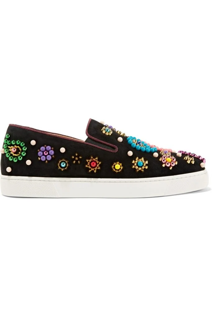 Louboutin are well-known for their embellishments in the form of studs and spikes, but these suede slip-ons take on a sweeter note.