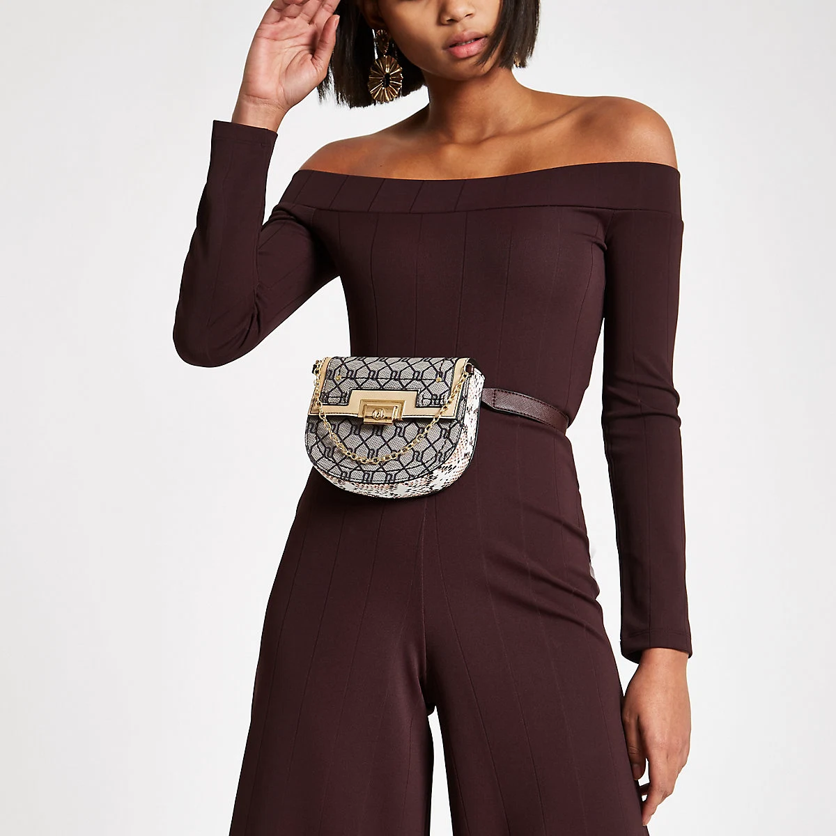 Beige RI monogram lock front belted bum bag, €35 at River Island