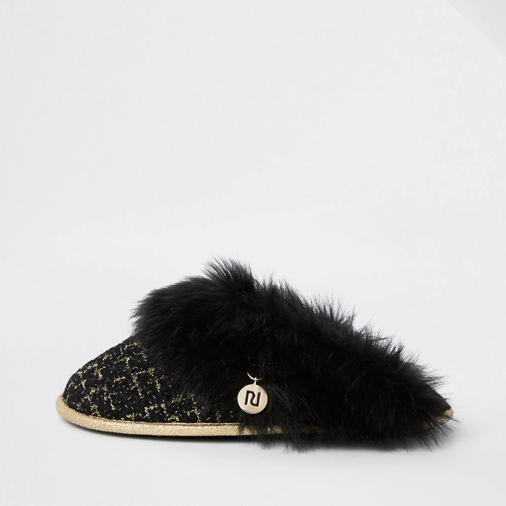 Black boucle faux-fur trim slippers, €21 at River Island
