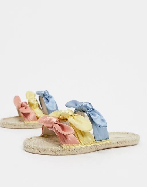 ASOS DESIGN Joanna satin bow espadrille mules in pastel, €30.42 from ASOS