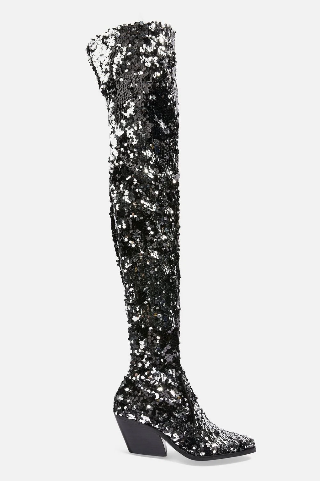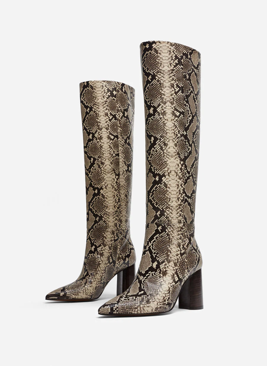 There’s been a common misconception about this high-rise boot trend since its introduction way back when; that it’s one for the fabulously tall supermodels of the world. I’m a relatively short person, so I used to steer clear of anything over-the-knee. But today, designers and high-street retailers are creating the statement boot in a myriad of shapes and different heights. If you’re shorter than average (like myself), don’t opt for a style that hits your hipbone; but go for something just above your knee instead. If you’re blessed with height, I suggest going for a mid-thigh style. I’m personally into the sleek black pairs, but I’ve included some print options for our colourful IMAGE gals. Wear yours over skinny jeans or leggings for extra warmth, style them under a winter frock or pleated skirt, or show off your monogram tights by wearing a short hemline. From snakeskin prints and sequin styles, to bold red designs, shop my edit of over-the-knee boots that you can buy as of today:
