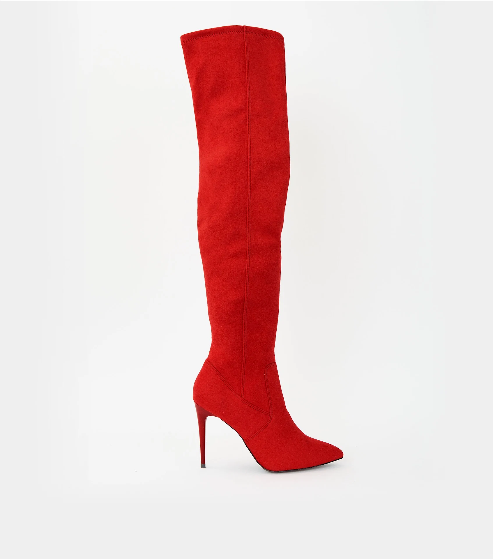 Red suedette stiletto over the knee boots, reduced from €59.99 to €30.00 at New Look