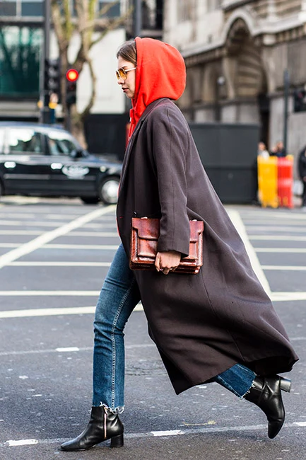 There’s a lovely juxtaposition between a hooded sweatshirt and a smart full-length coat that makes this outfit feel really fresh. Hoodies are usually paired with bomber jackets or padded parkas, so I love how this woman has flipped that tradition on its head and gone for a look that’s unexpected and modern. Plus, you’ll be cosy in the worst of the winter weather.