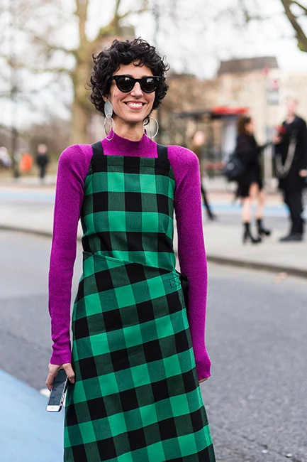 Women often forget how important colour is to a winter wardrobe. At this time of year, the high-street is populated with people swaddled in charcoals and black, which is why Yasmin Sewell makes such a strong statement in this fuchsia top and green gingham pinafore dress. Experiment with colour and print by opting for earthy shades that work effortlessly together.