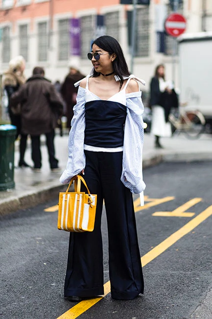 I’m not quite sure how this ensemble works (are the sleeves actually part of a shirt or stand-alone add-ons to the outfit?), but I love how it looks. Bandeau tops are a great way of adding another layer and additional interest to your outfit. These oversized sleeves contrast beautifully with this street style star’s slim waist and neat frame. Bare shoulders are also balanced by the voluminous wide-leg trousers.