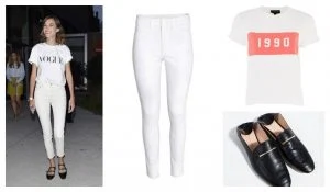 Alexa is queen of low key and we?love her simple styling of these skinny cropped white denims. The black loafers nicely anchor the look, while the Vogue slogan tee is like a cheeky fashion in-joke. We love this high street dupe of Bella Freud’s?graphic logo and these Parfois loafers are the cutest chic cheat we’ve seen of late.